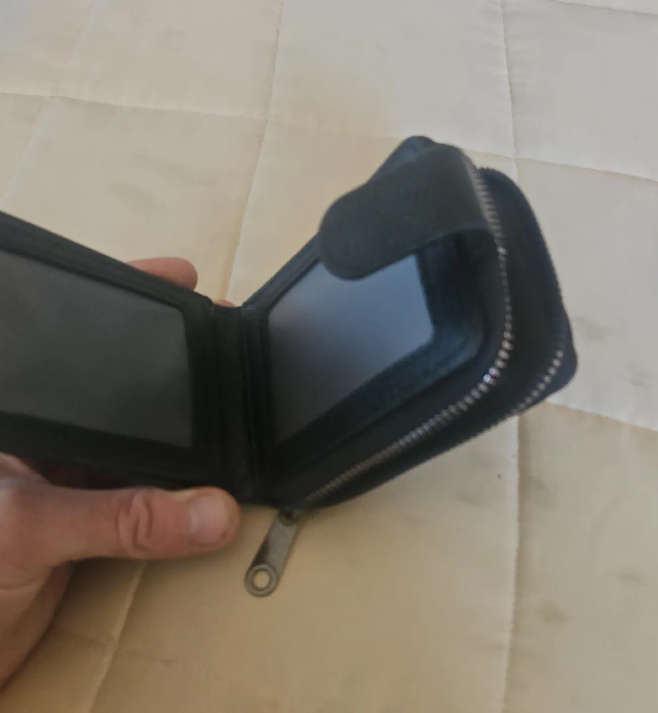 Selling a black leather wallet. It features a zipper closure and space for cards and IDs. It's in great condition!