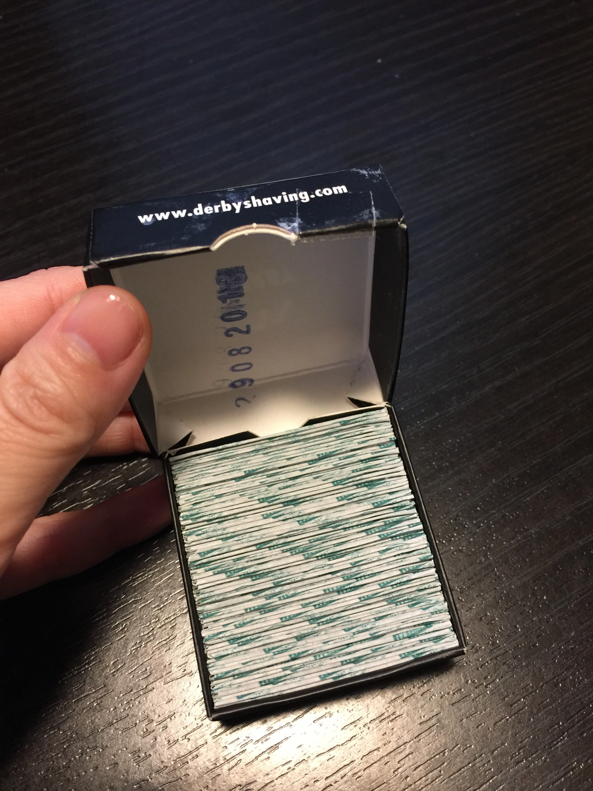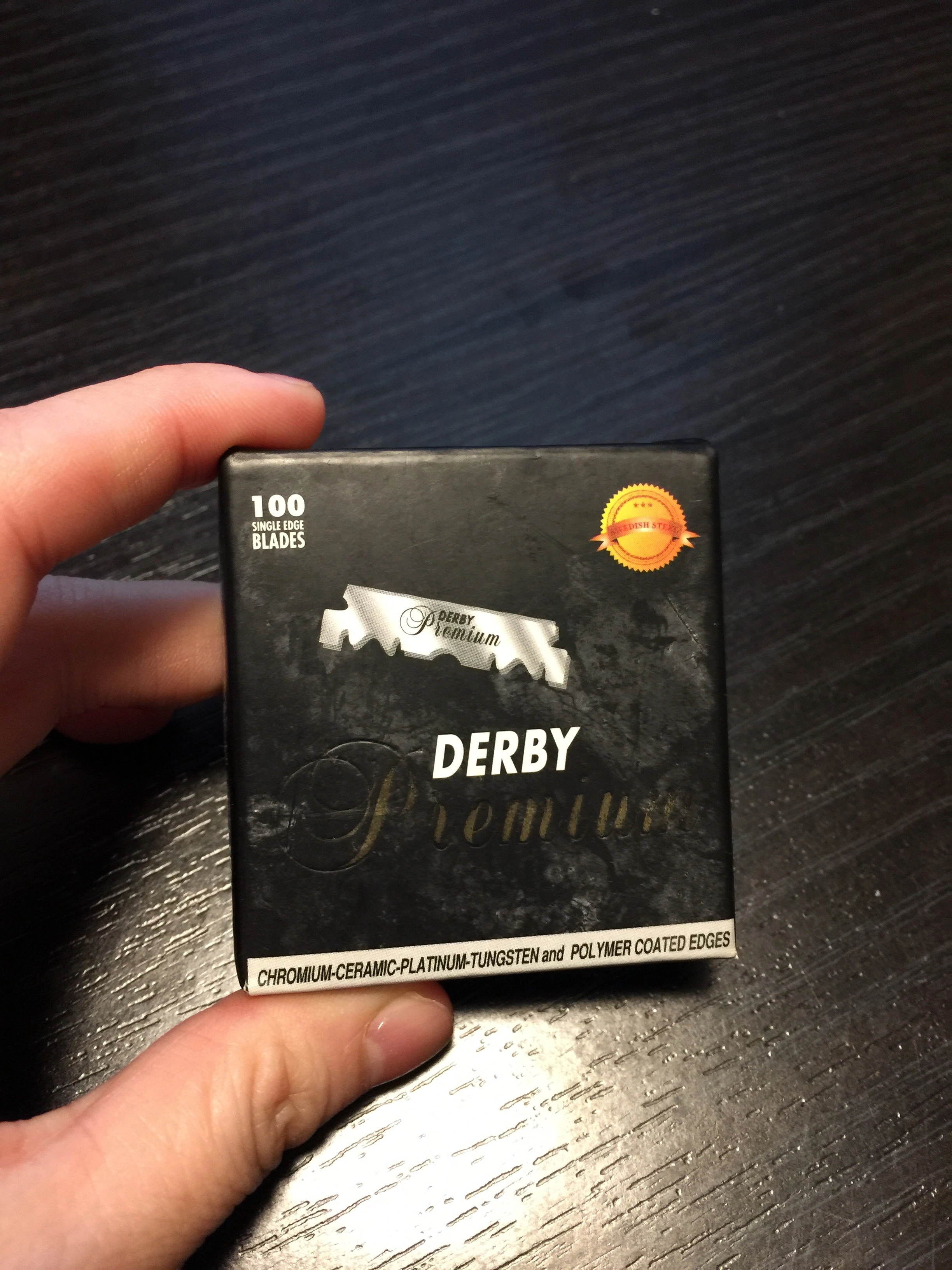 Selling a box of Derby Premium single edge blades. The box contains 100 blades, perfect for shaving or other utility purposes. The blades are chromium-ceramic-platinum-tungsten and polymer coated edges.