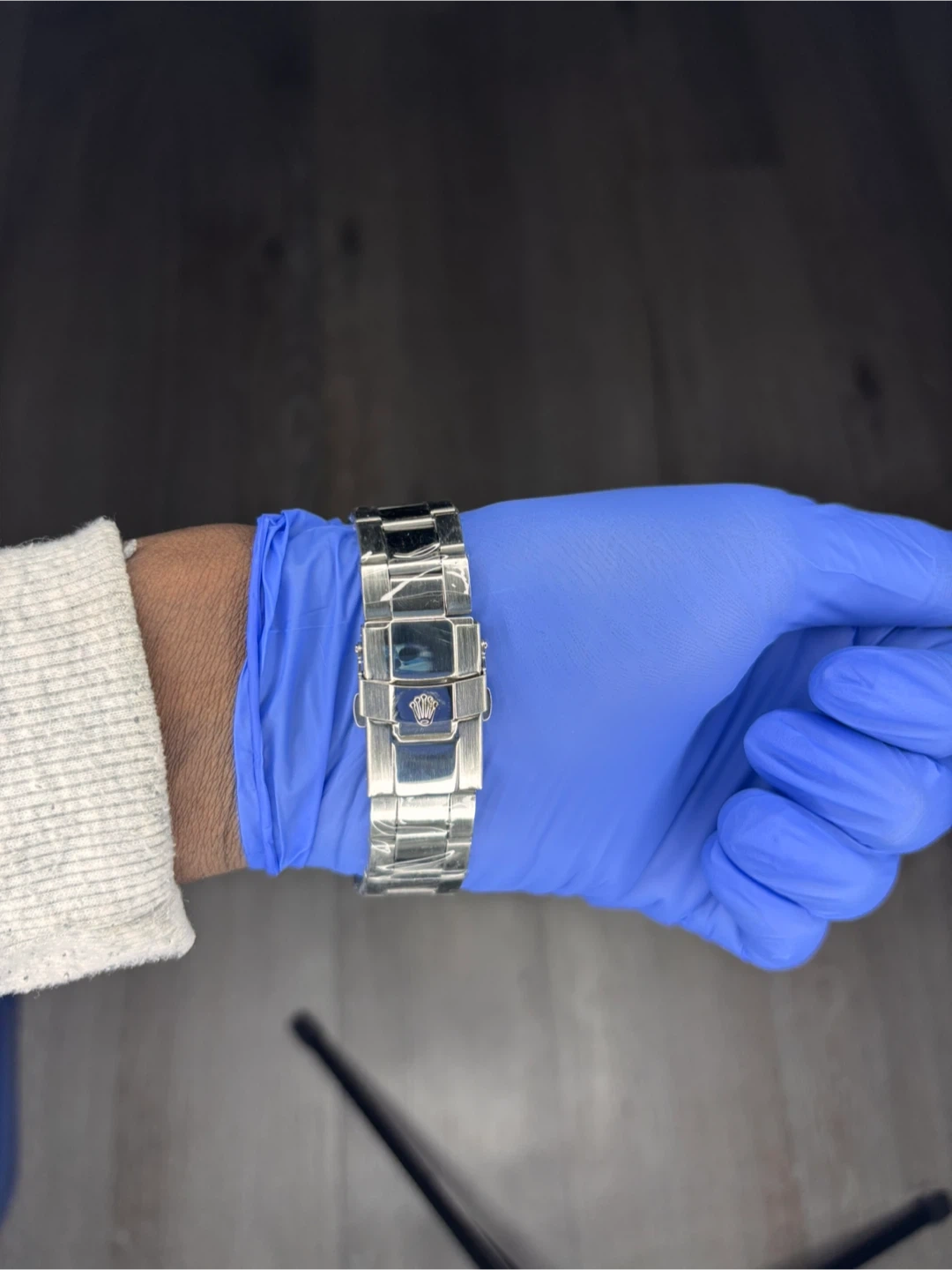 Selling a Luxury Watch -Master II watch with a stainless steel band. It comes with its original box! The watch has a unique blue and white patterned face.