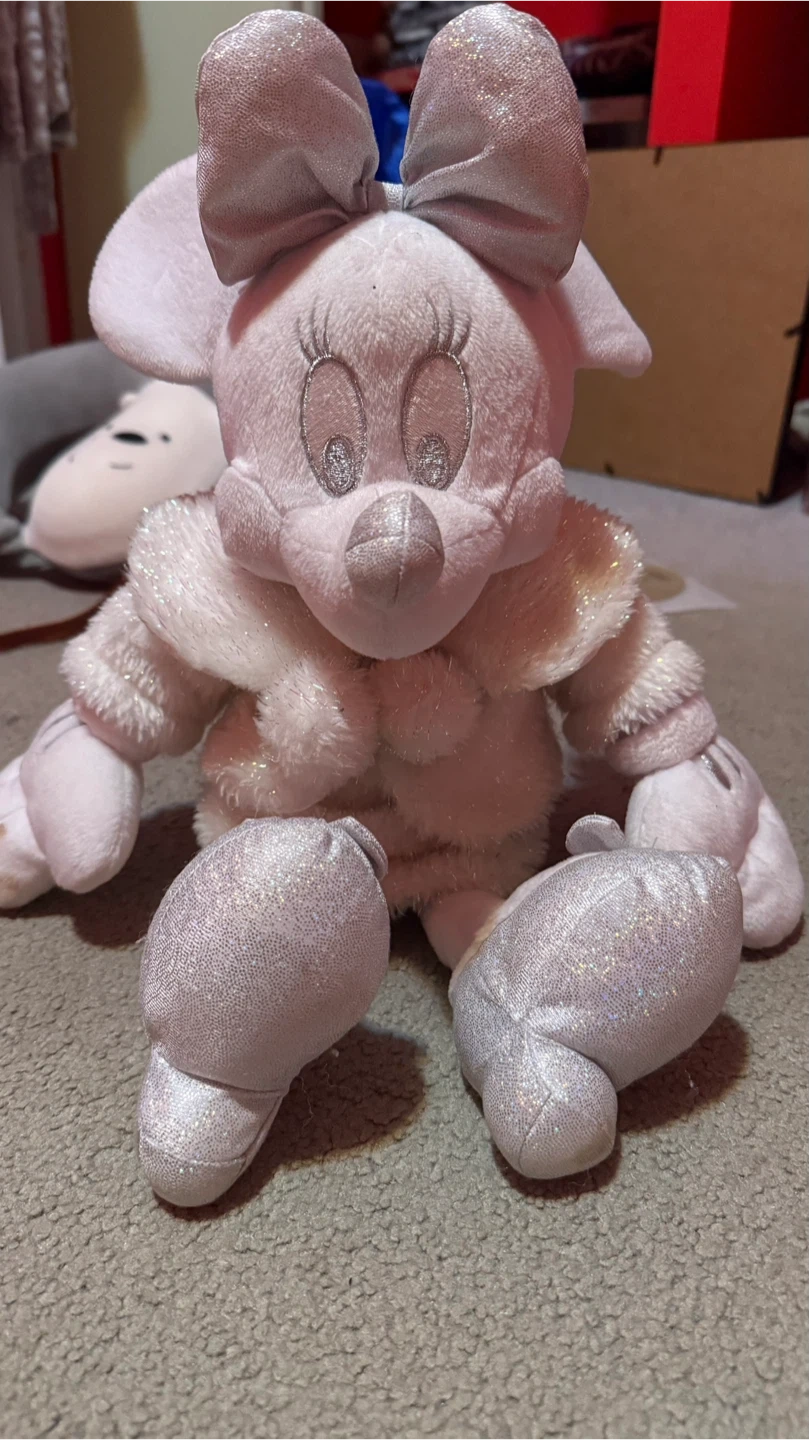 Selling a cute Minnie Mouse plush! It's in great condition and ready for a new home. The plush is a light pink colour with silver glitter accents. Perfect for any Disney fan or as a cuddly friend for a little one