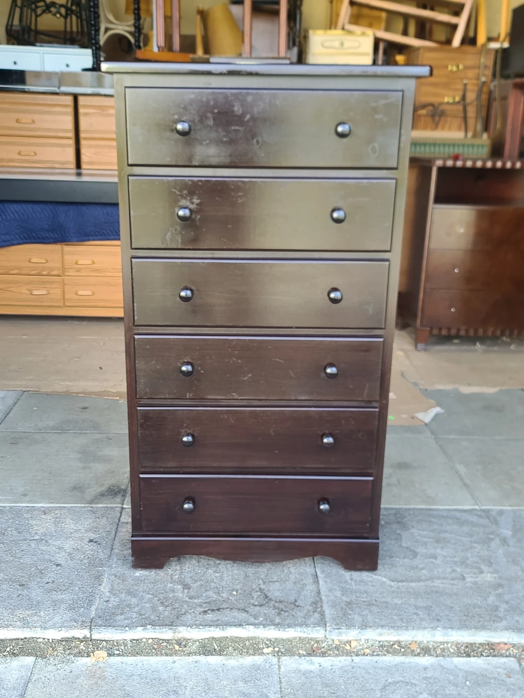 Sturdy tall chest of drawers with six smooth-sliding drawers. Finished in a dark brown with solid wood drawer interiors. Great storage for bedroom, hallway, or apartment use. Structurally solid with normal cosmetic wear from use. Measurements: W 31" X D 18" X H 54 1/2". Delivery can be arranged. Viewing and pickup by appointment.