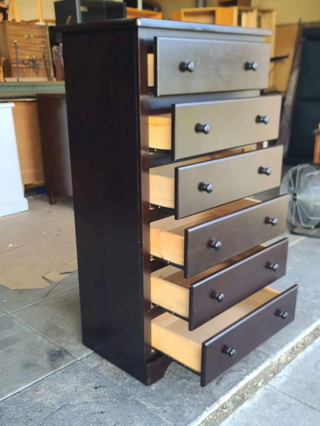 Sturdy tall chest of drawers with six smooth-sliding drawers. Finished in a dark brown with solid wood drawer interiors. Great storage for bedroom, hallway, or apartment use. Structurally solid with normal cosmetic wear from use. Measurements: W 31" X D 18" X H 54 1/2". Delivery can be arranged. Viewing and pickup by appointment.