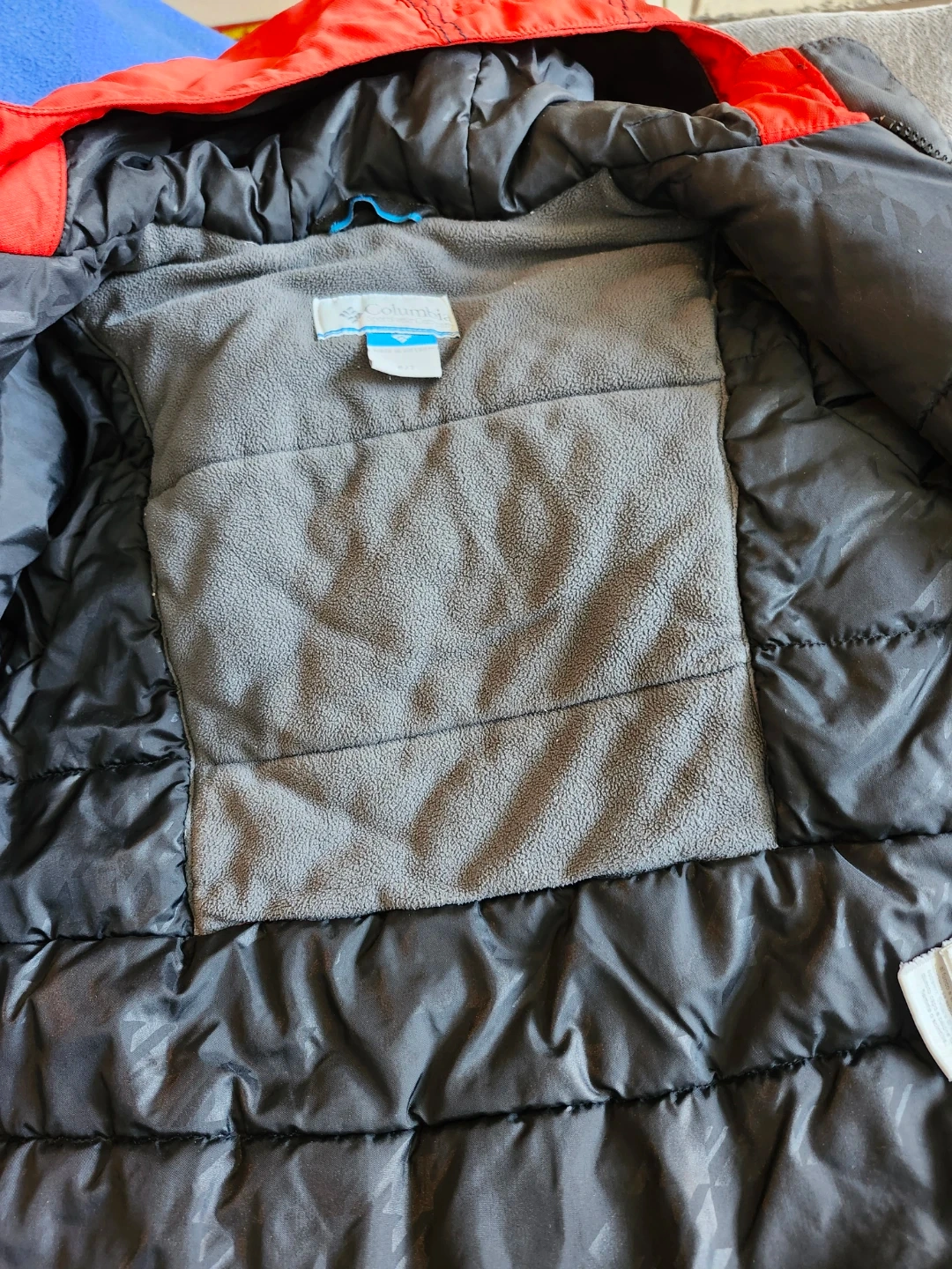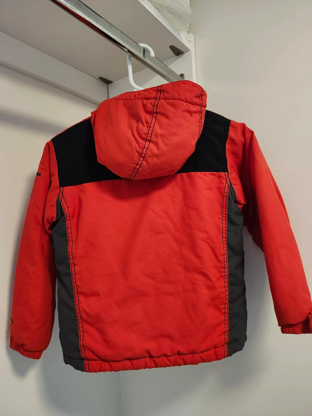 Cozy lined and water repellant jacket for winter and early spring days. In good condition, but missing the top part of the 3 velcro strips beside the zipper (not necessary anyways but would be an easy fix). Freshly laundered.