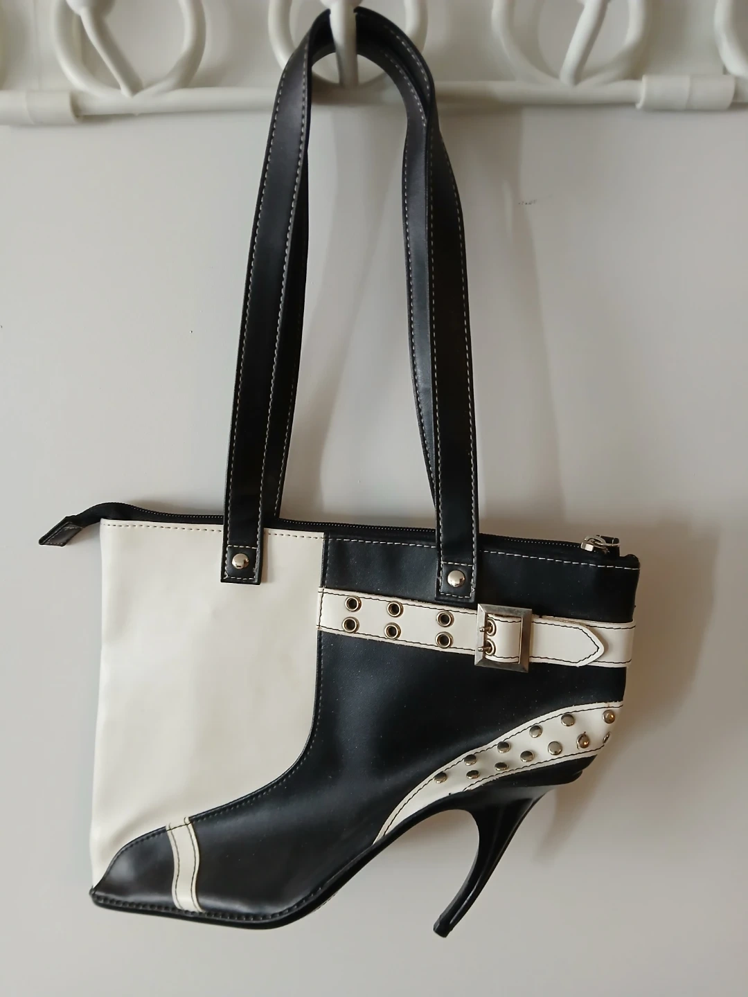 Check out this unique tote bag shaped like a high-heeled shoe! It's a fun and stylish statement piece. The bag features a colour block design in cream, burgundy, and black. Perfect for adding a quirky touch to your outfit!