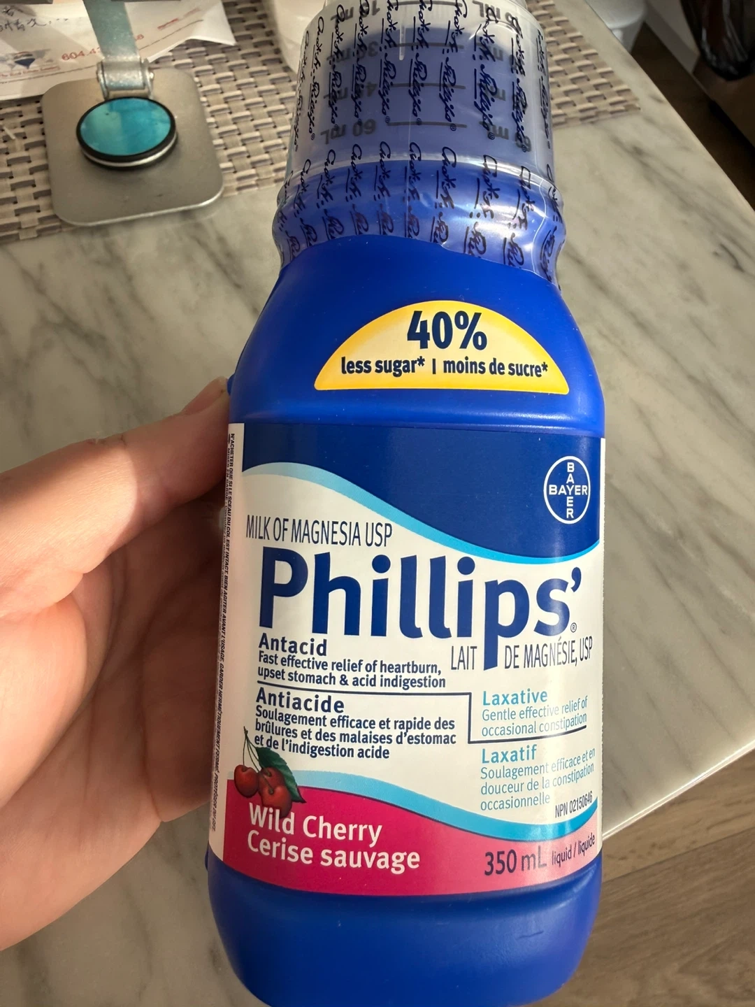 ✅ Selling a bottle of Phillips' Milk of Magnesia in Wild Cherry flavour. It provides fast, effective relief of heartburn, upset stomach, and acid indigestion. It's also a gentle and effective relief for occasional constipation.