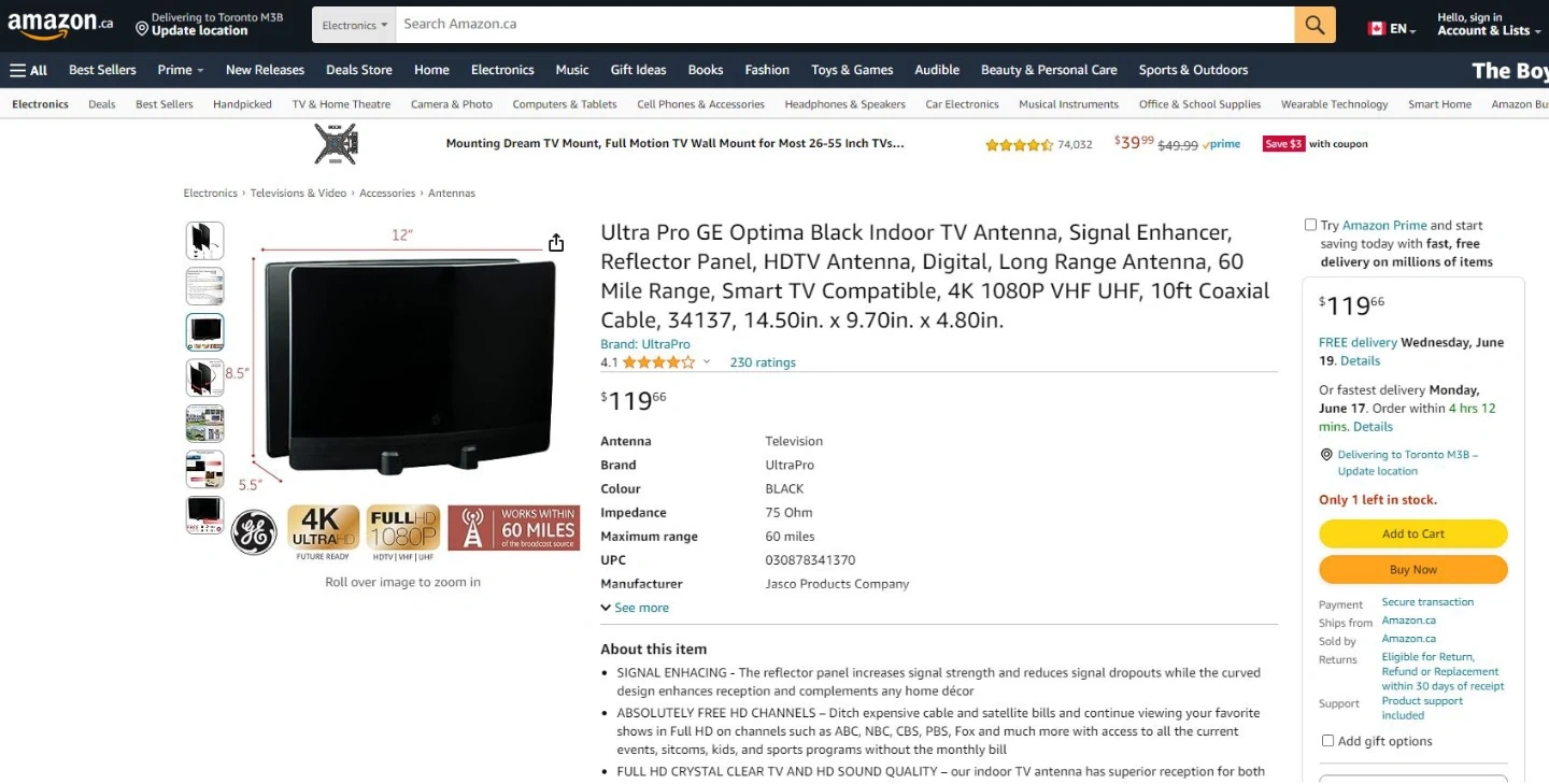 GE UltraPro Optima HD Curved Antenna, 60 Miles Range. (3 available)