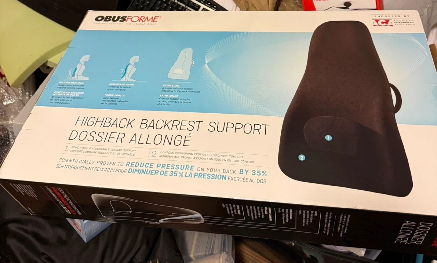 Selling an ObusForme Highback Backrest Support. It is designed to reduce pressure on your back by 35%. It features removable and adjustable lumbar support and contour cushioning that provides supportive comfort. This backrest support is engineered for the human body and endorsed by the American Chiropractic Association