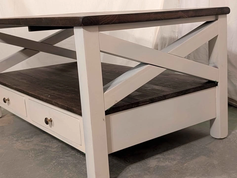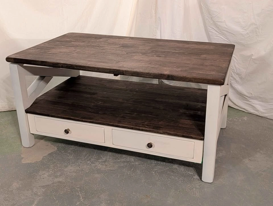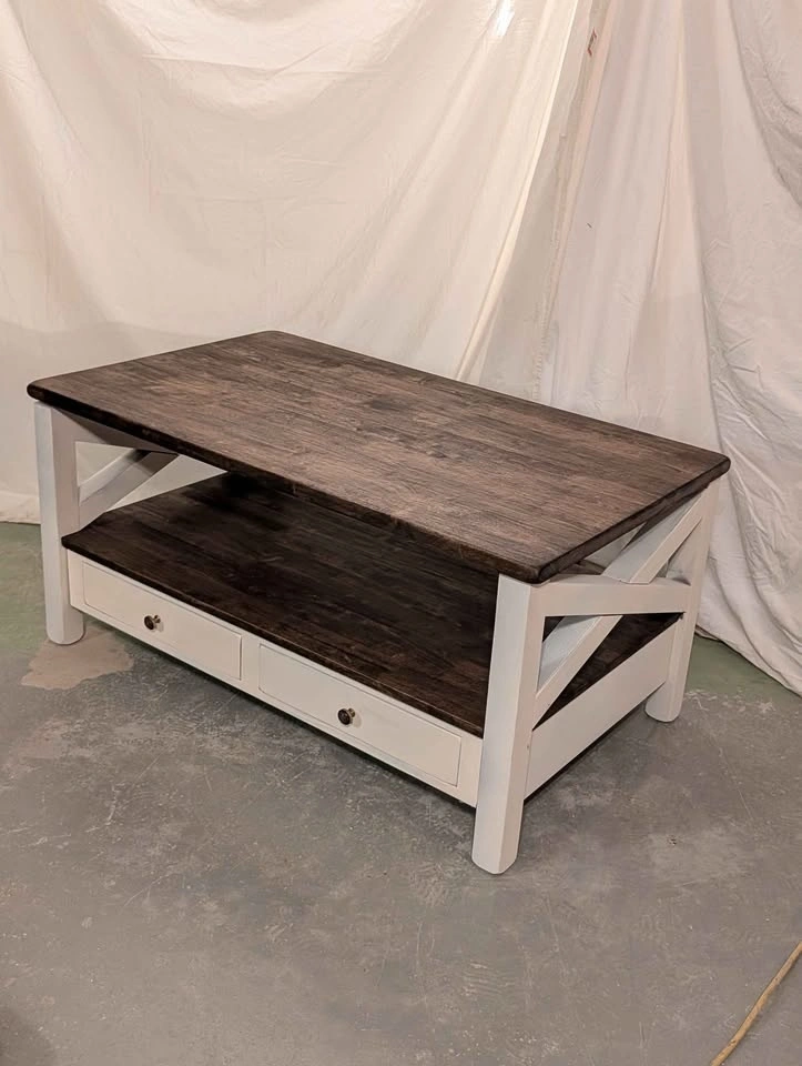 Just finished! This is a stunning, high-quality solid hardwood coffee table. It is an incredibly solid and heavy piece (weighing around 200 lbs)—built to last a lifetime.