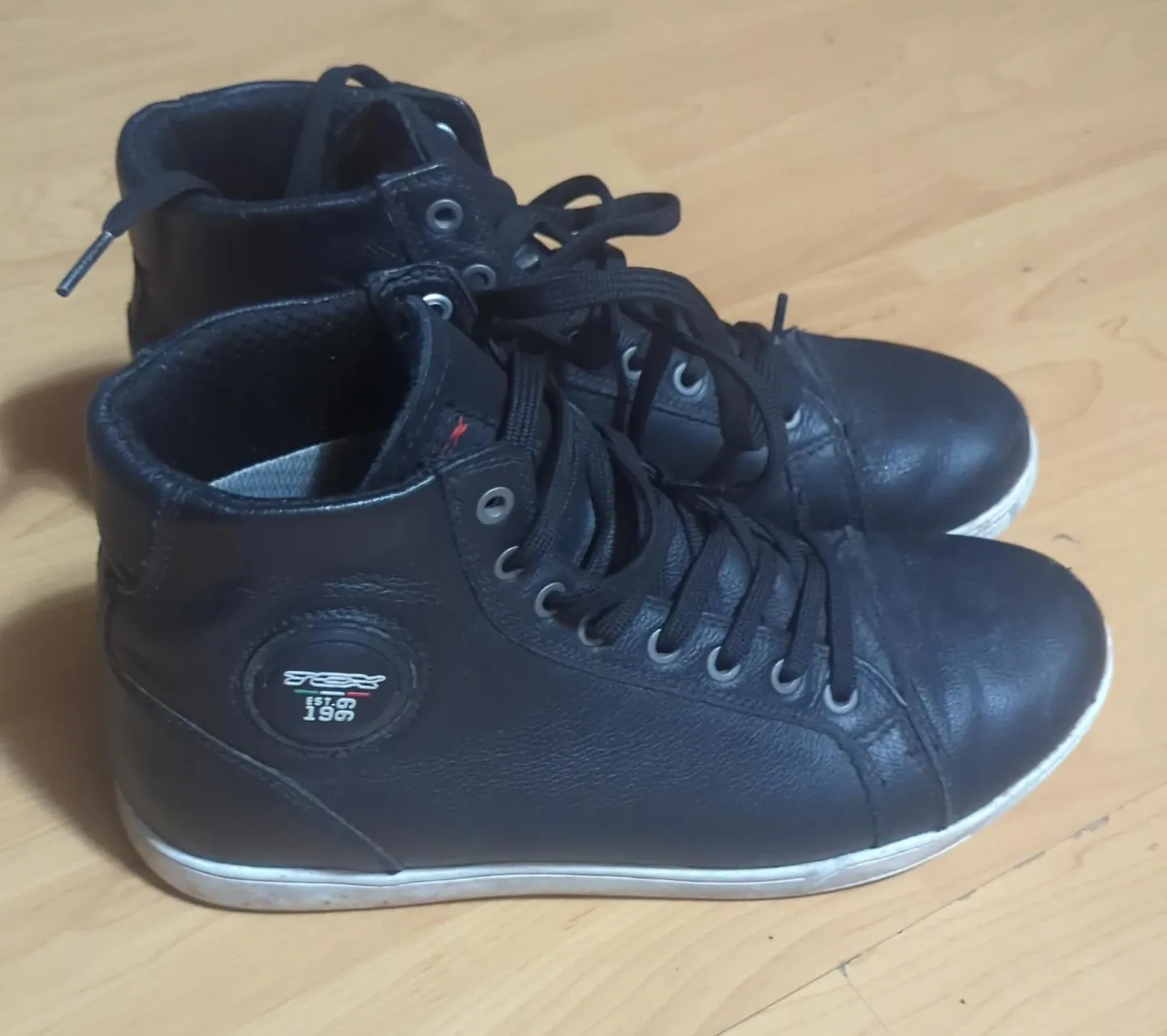 Selling a pair of TCX motorcycle riding shoes. They are black leather high-tops with laces. The logo is visible on the side. They are in good used condition!