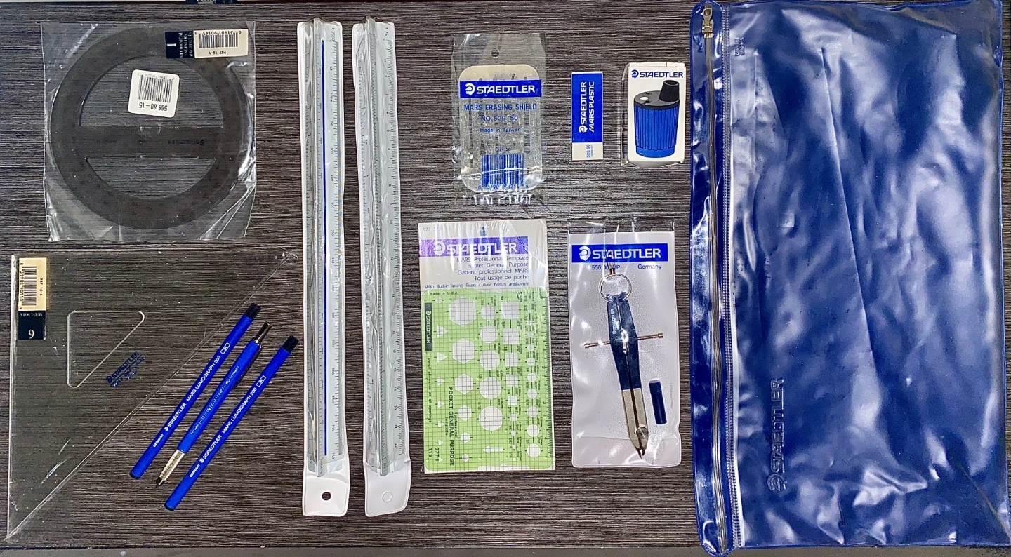 STAEDTLER - Complete Mechanical Architectural Engineering Tools 13-Piece Set including: - Geometry set squares (2 Included) - Triangular Imperial Reduction Scale Rulers (2 Included) - MARS Erasing Shield - MARS Professional Template Pocket General Purpose (with built-in inking risers) - MARS Lumograph 3H (2 included) - STAEDTLER Mars Technico Lead Holder - STAEDTLER Lead Pointer - STAEDTLER MARS Plastic Premium Eraser – White - STAEDTLER Advanced Compass (Includes lead refill) STAEDTLER case included. Made in Germany. Purchased for the Architectural Engineering Degree program at the University of Waterloo. -Retail selling at $147.62 + taxes (166.81 including taxes) Reduced Price $99 OBO for the set!! Brand New.