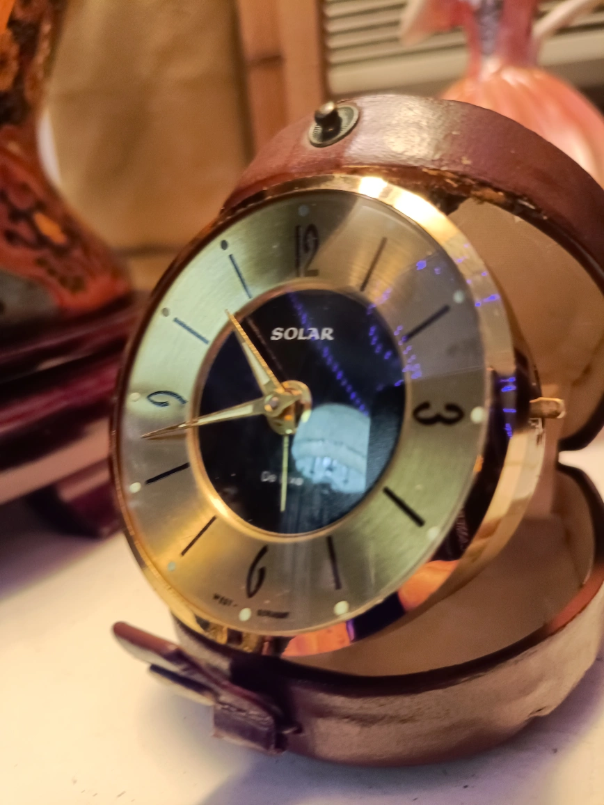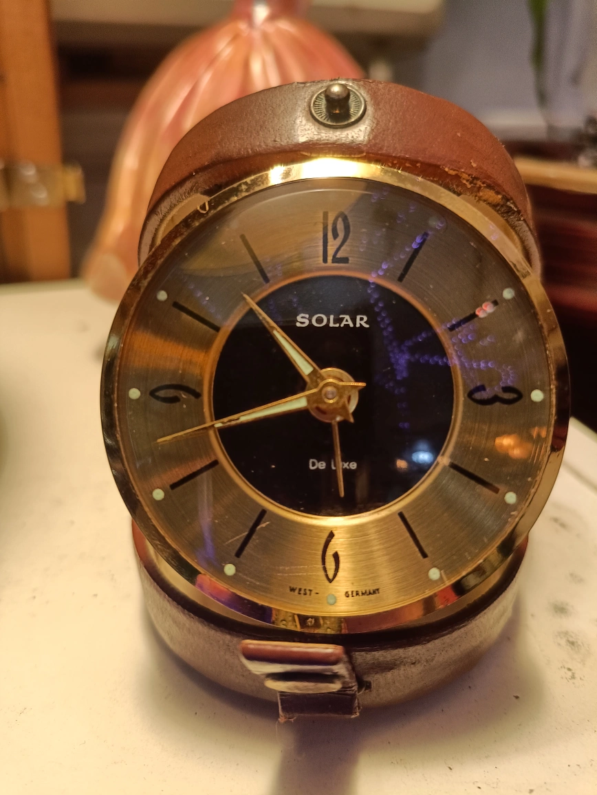 This is a beautiful well made travel alarm clock with its original 100% brown leather case. Made in the early 1950's in Germany by Solar Clock Co. ®️ known for their quality ! The clock winds and keeps perfect time if lying flat but stops after 30min or so when in its intended position. The price reflects this it just needs a little tune up and cleaning