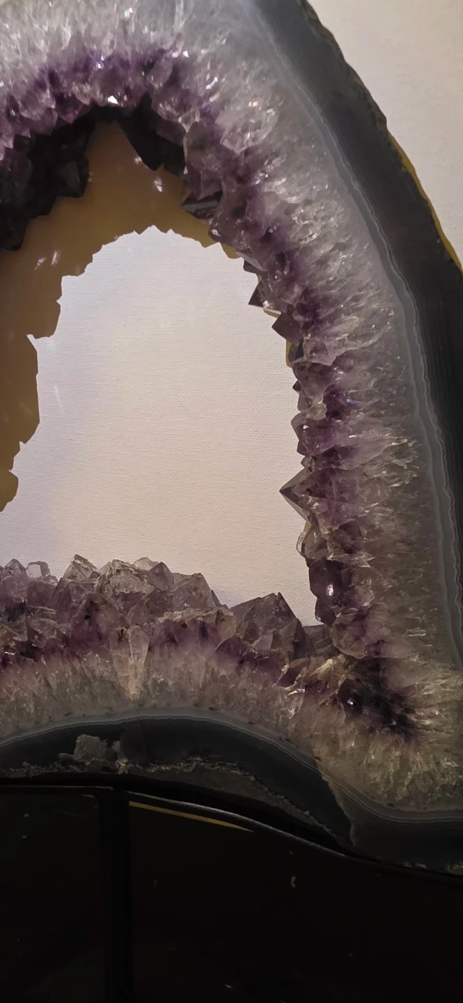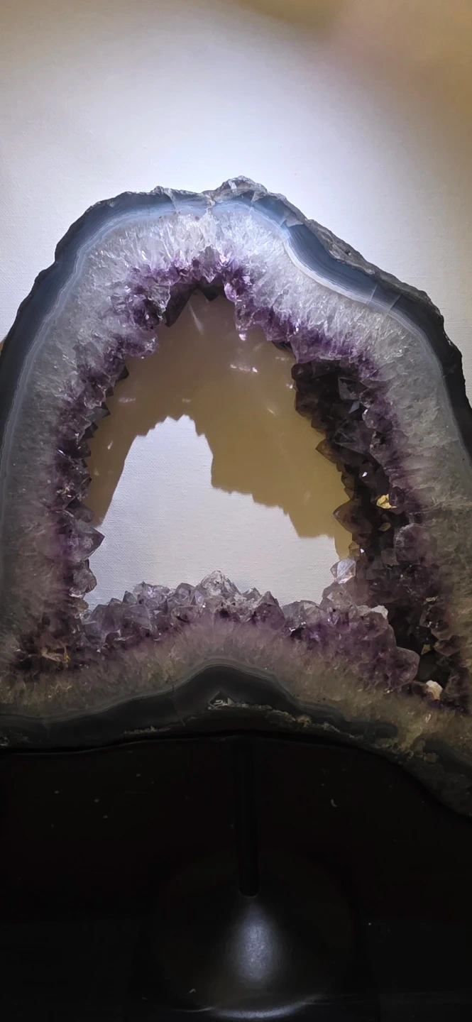 Bring the magic of the earth into your space with this gorgeous amethyst cathedral geode! Standing about 1 foot tall and wide, this 13.5-pound natural beauty features deep purple crystals and striking agate banding. Perfect for home décor, meditation, or as a unique statement piece. Elevate your space with this timeless treasure!