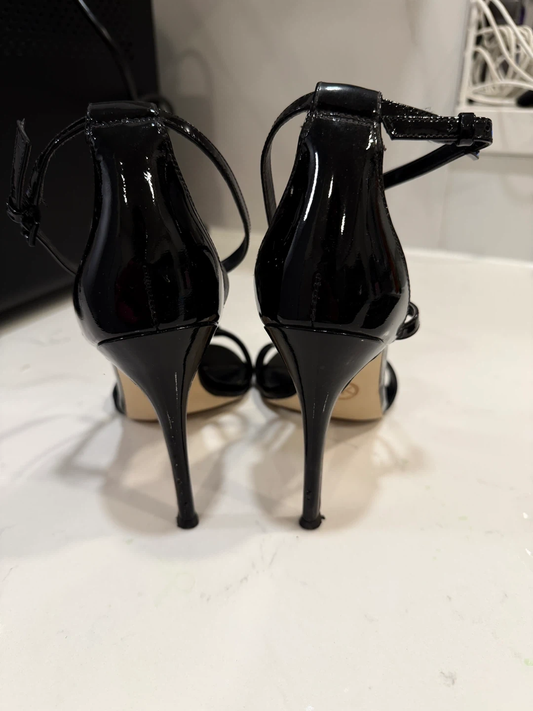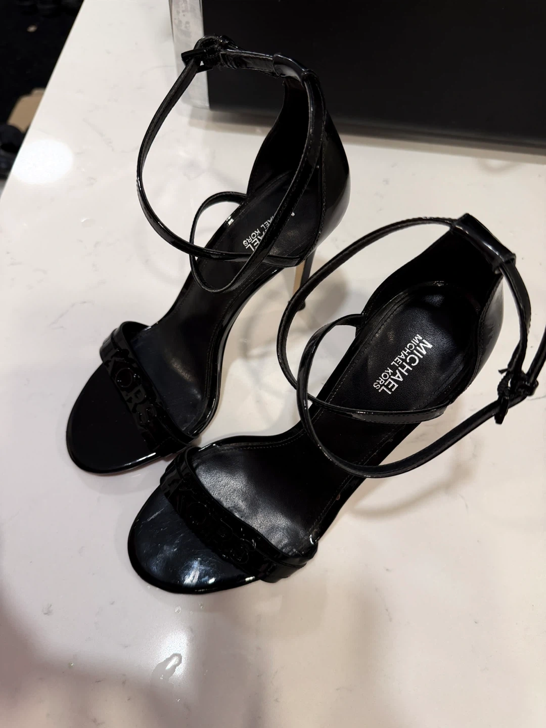 Selling a pair of stylish black Michael Kors heels. These heels are in great condition and would be a fantastic addition to your wardrobe. They feature the MK logo on the front strap. Perfect for a night out or a special occasion! Price negotiable