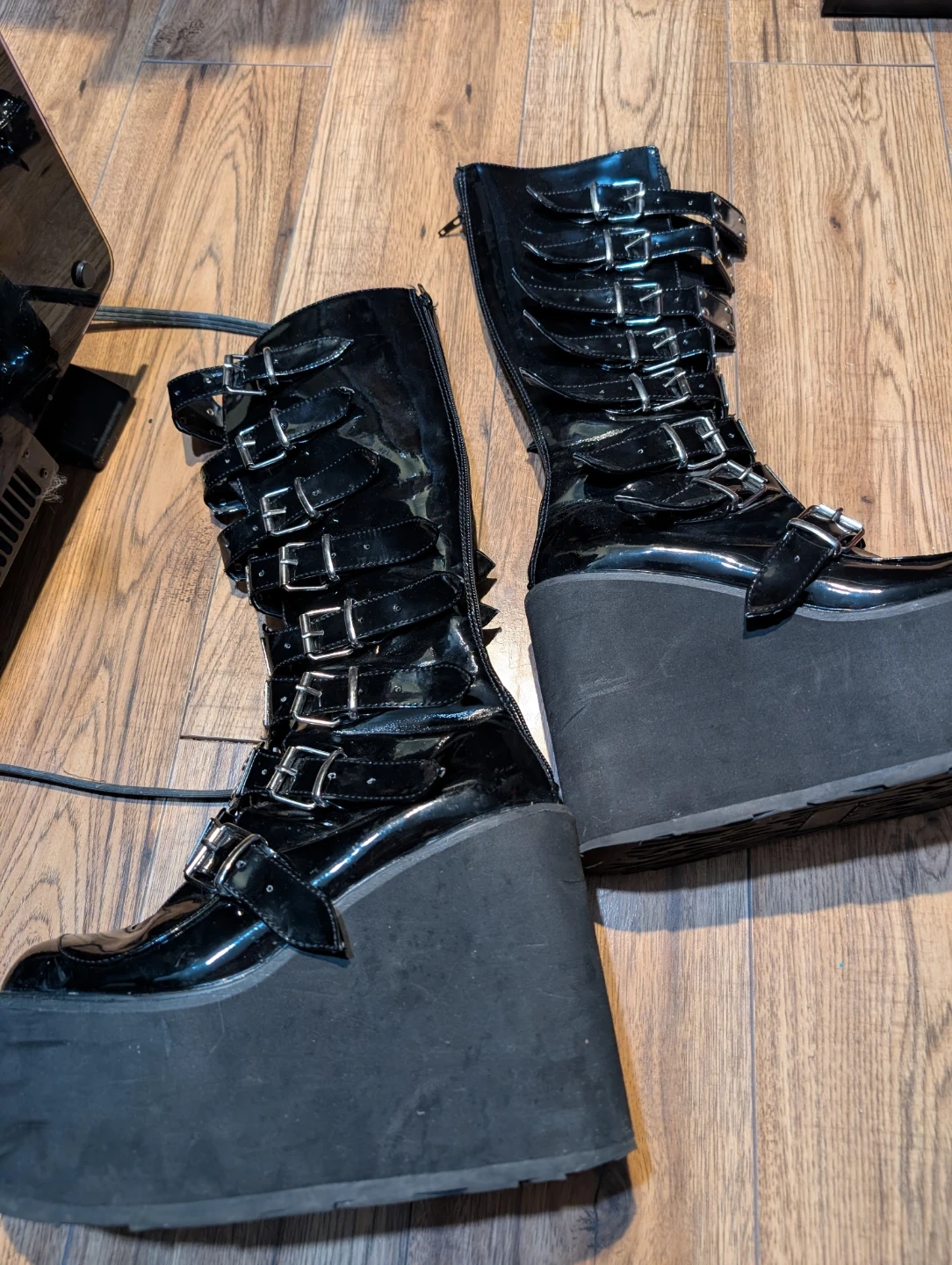 Selling a pair of Demonia platform boots in black, size 10. They feature a lot of buckles and a zipper on the side. Great for a goth or alternative look!