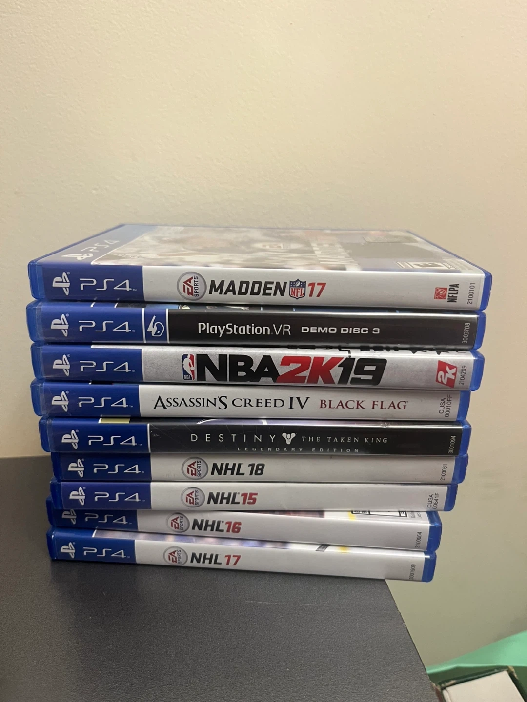 Selling a collection of PS4 games! Titles include Madden 17, PlayStation VR Demo Disc 3, NBA 2K19, Assassin's Creed IV Black Flag, Destiny The Taken King Legendary Edition, NHL 18, NHL 15, NHL 16, and NHL 17