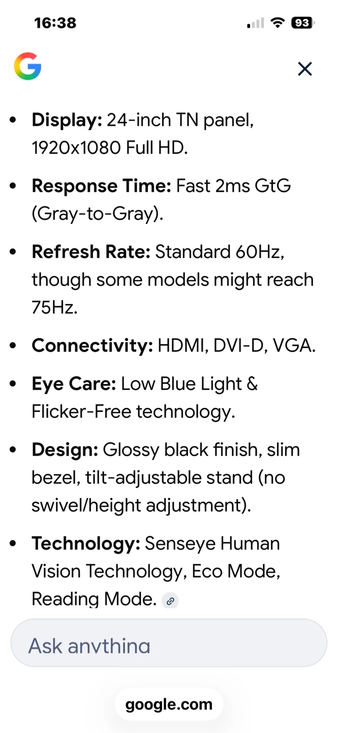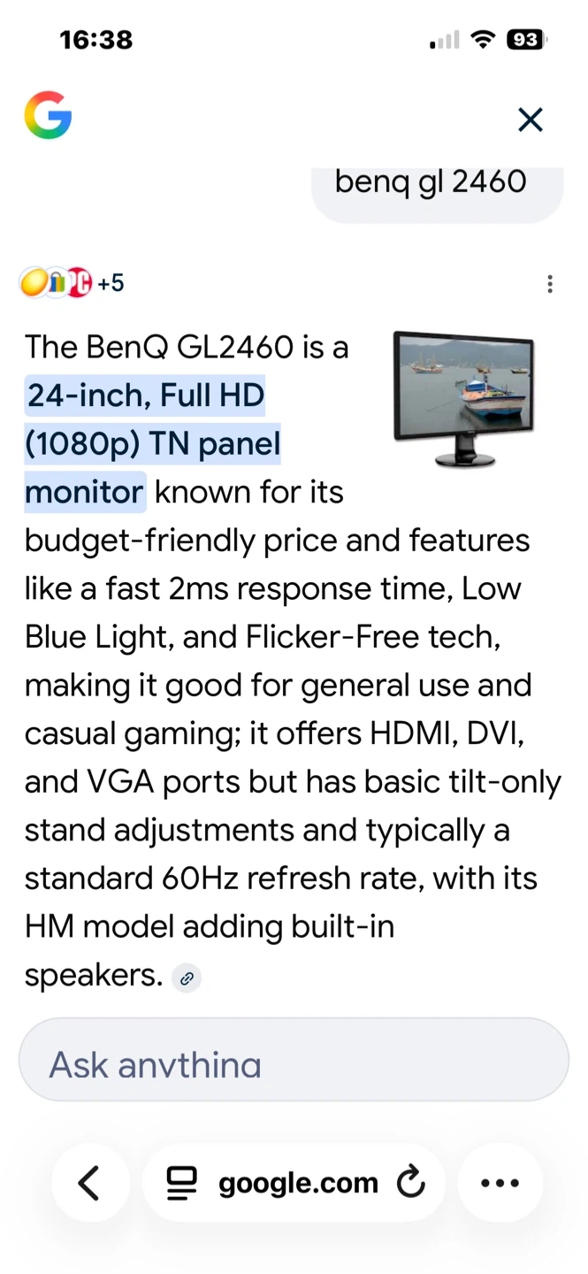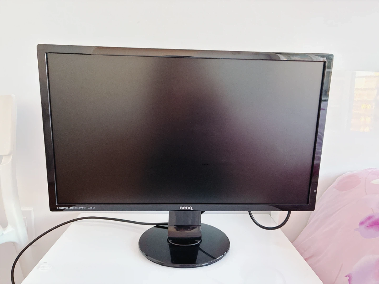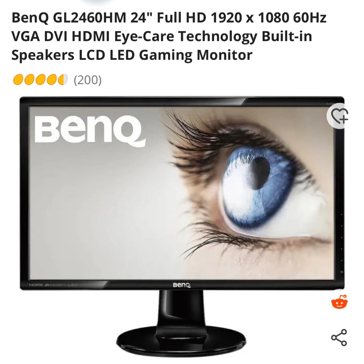 Selling a BenQ GL2460HM 24-inch monitor. This monitor has a TN panel with a 1920x1080 Full HD display. It features a fast 2ms GtG (Gray-to-Gray) response time and a standard 60Hz refresh rate, though some models might reach 75Hz. Connectivity options include HDMI, DVI-D, and VGA. It also has Eye-Care Technology with Low Blue Light & Flicker-Free technology. The design features a glossy black finish, slim bezel, and tilt-adjustable stand