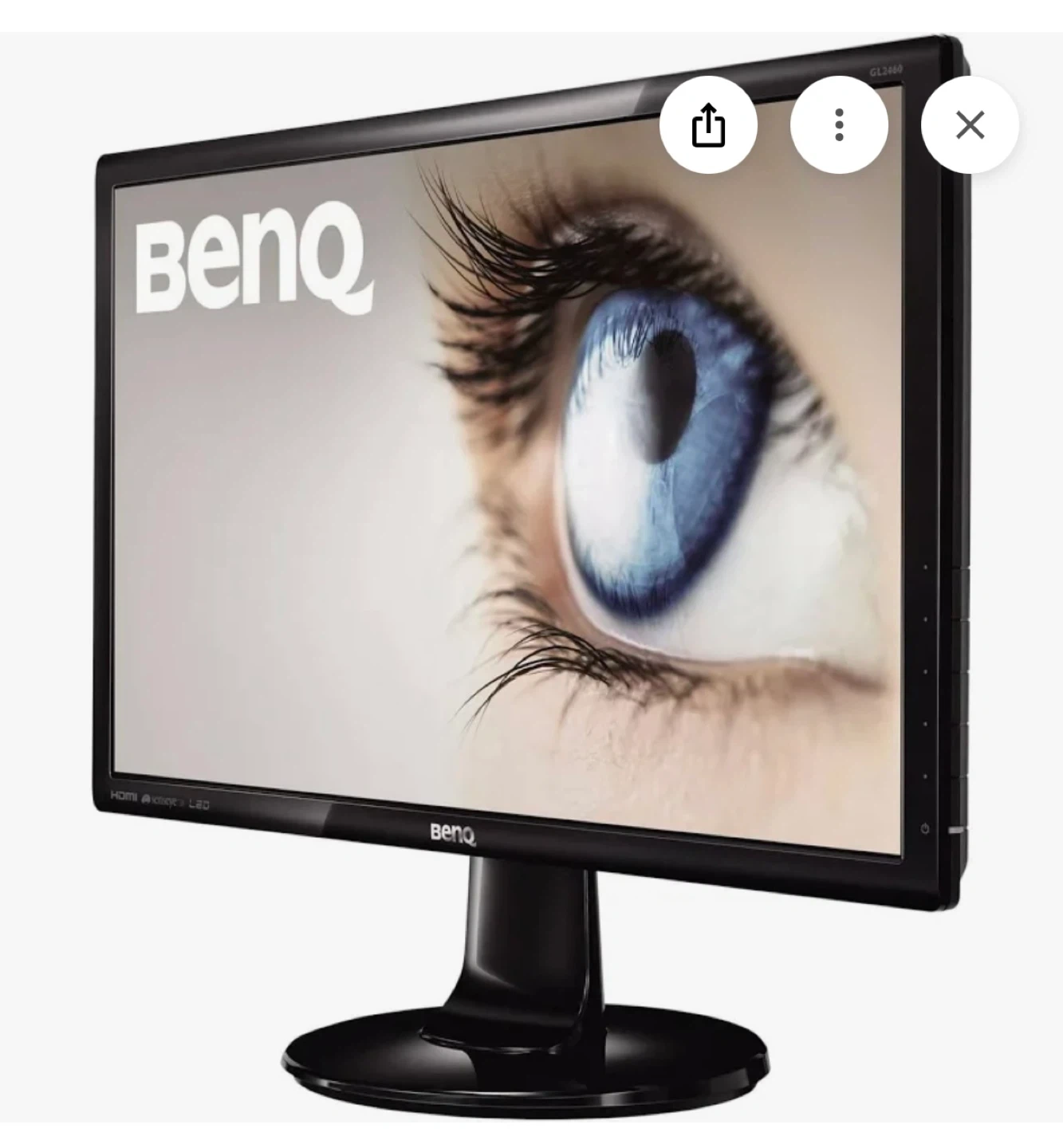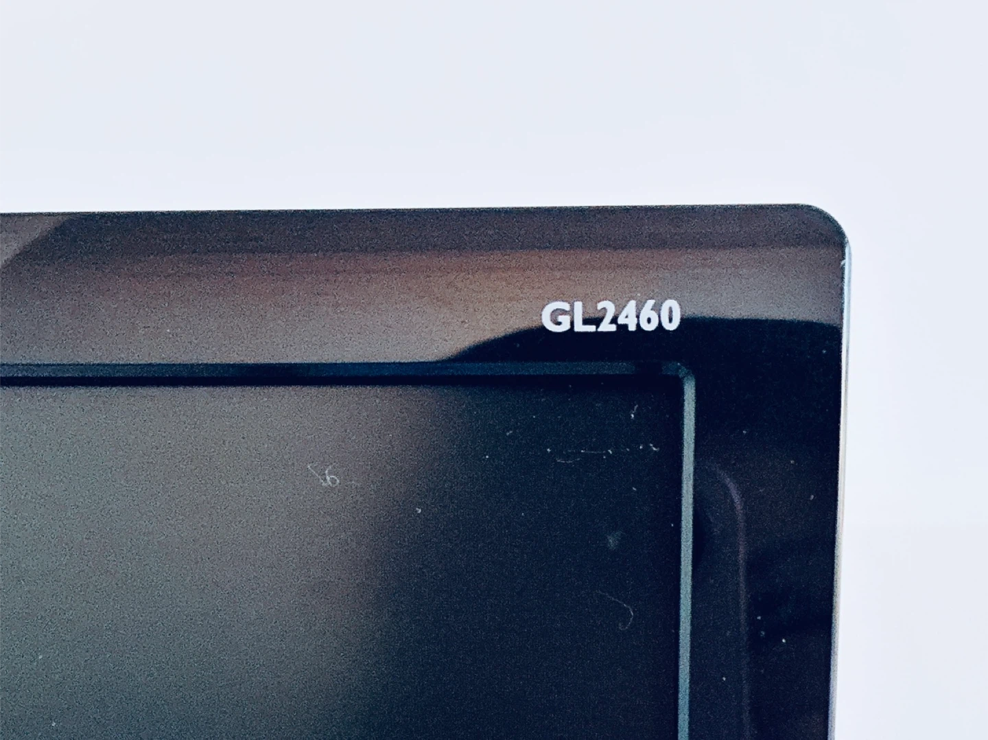 Selling a BenQ GL2460HM 24-inch monitor. This monitor has a TN panel with a 1920x1080 Full HD display. It features a fast 2ms GtG (Gray-to-Gray) response time and a standard 60Hz refresh rate, though some models might reach 75Hz. Connectivity options include HDMI, DVI-D, and VGA. It also has Eye-Care Technology with Low Blue Light & Flicker-Free technology. The design features a glossy black finish, slim bezel, and tilt-adjustable stand