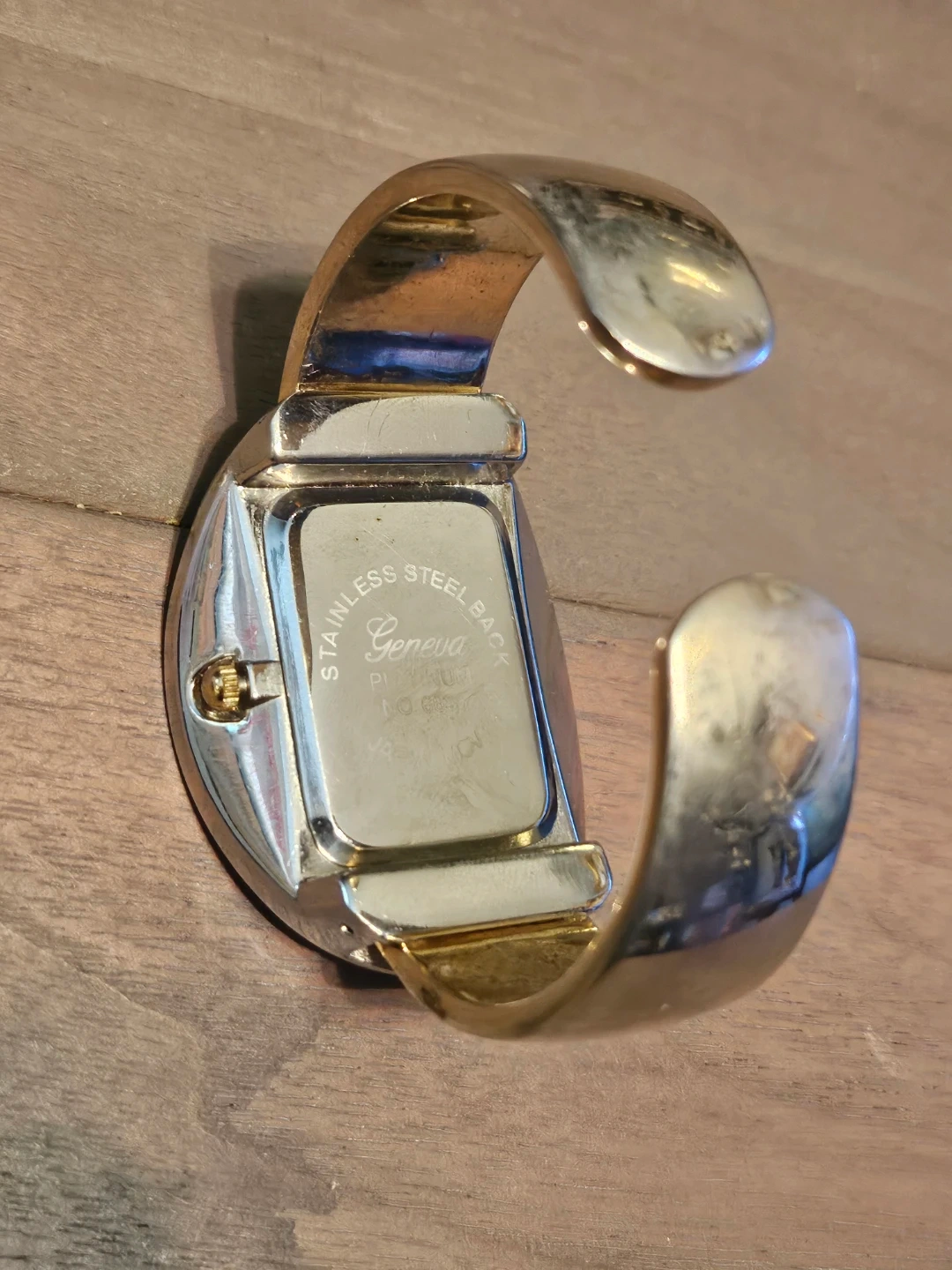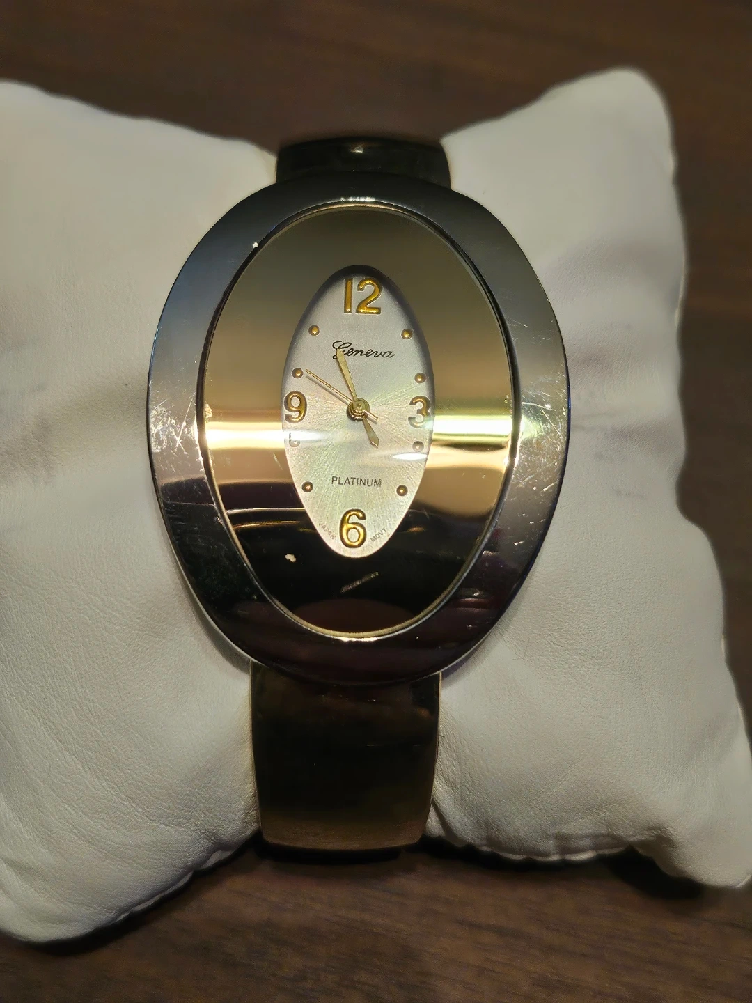 Selling a Geneva Platinum bangle watch. It's a stylish piece with a silver and gold tone. Has a Japan movement, the face has a unique oval shape with clear numbering. A nice addition to any jewellery collection!