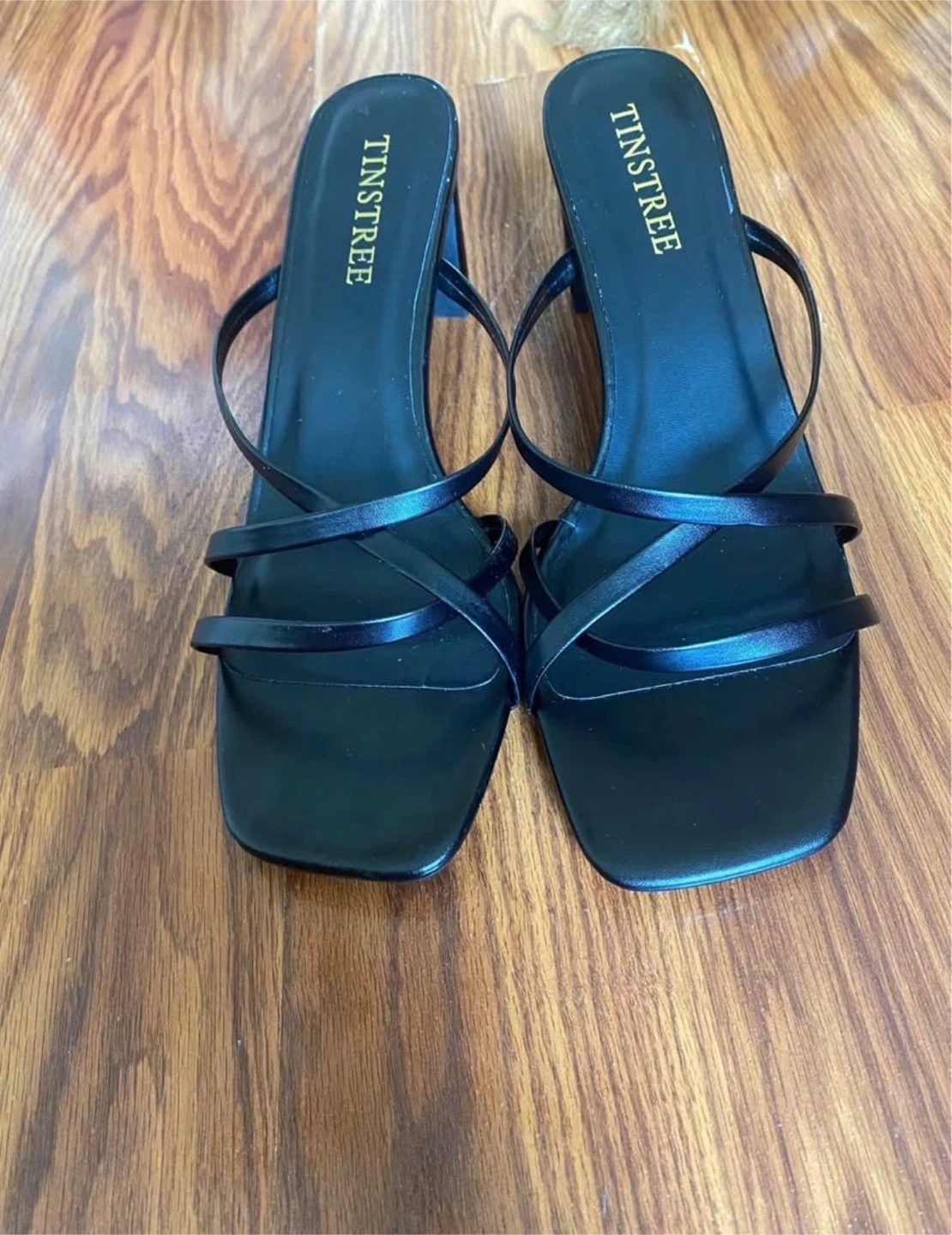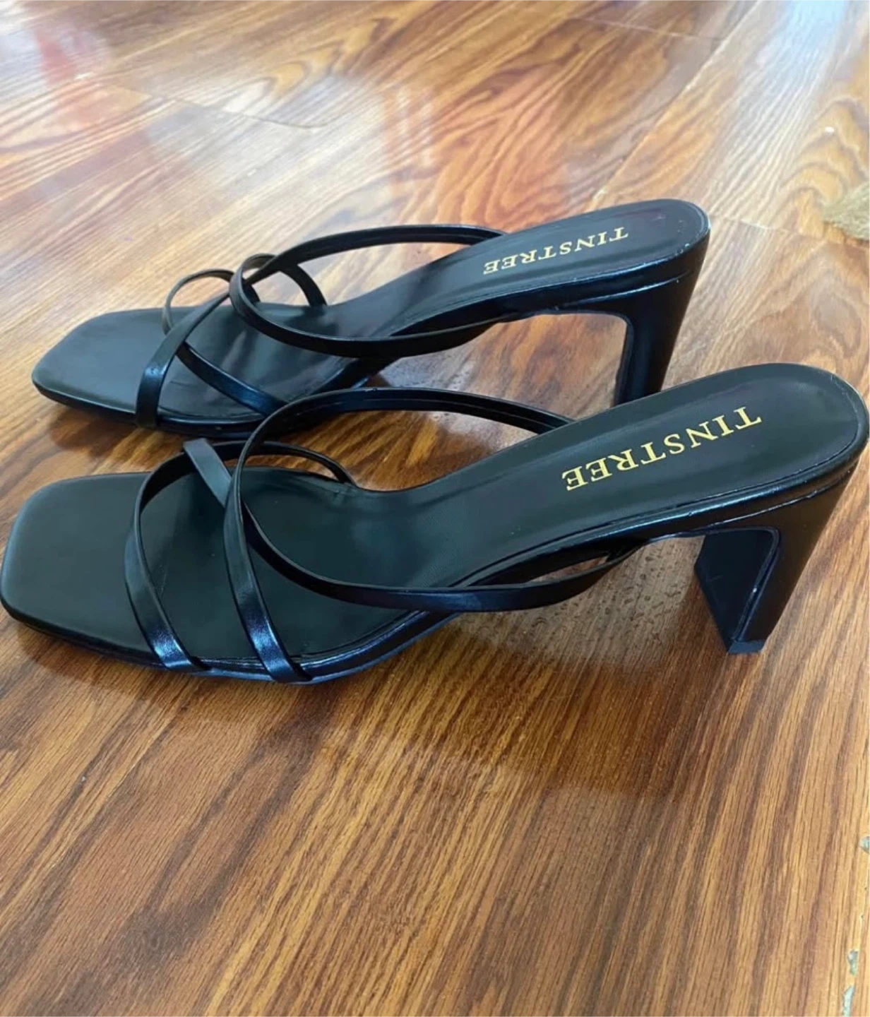 These are a pair of black heeled sandals from Tinstree. They feature a square toe and a strappy design. Perfect for dressing up or down!