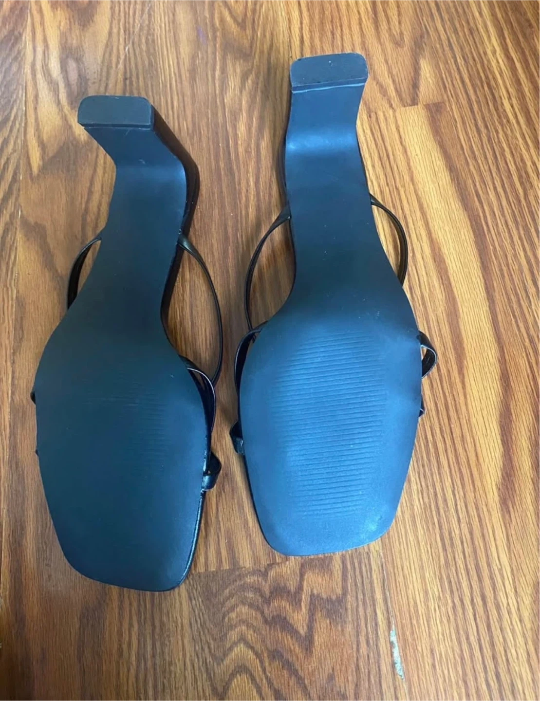 These are a pair of black heeled sandals from Tinstree. They feature a square toe and a strappy design. Perfect for dressing up or down!