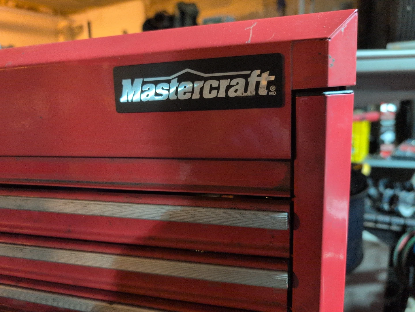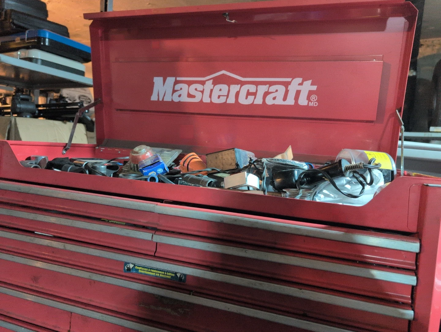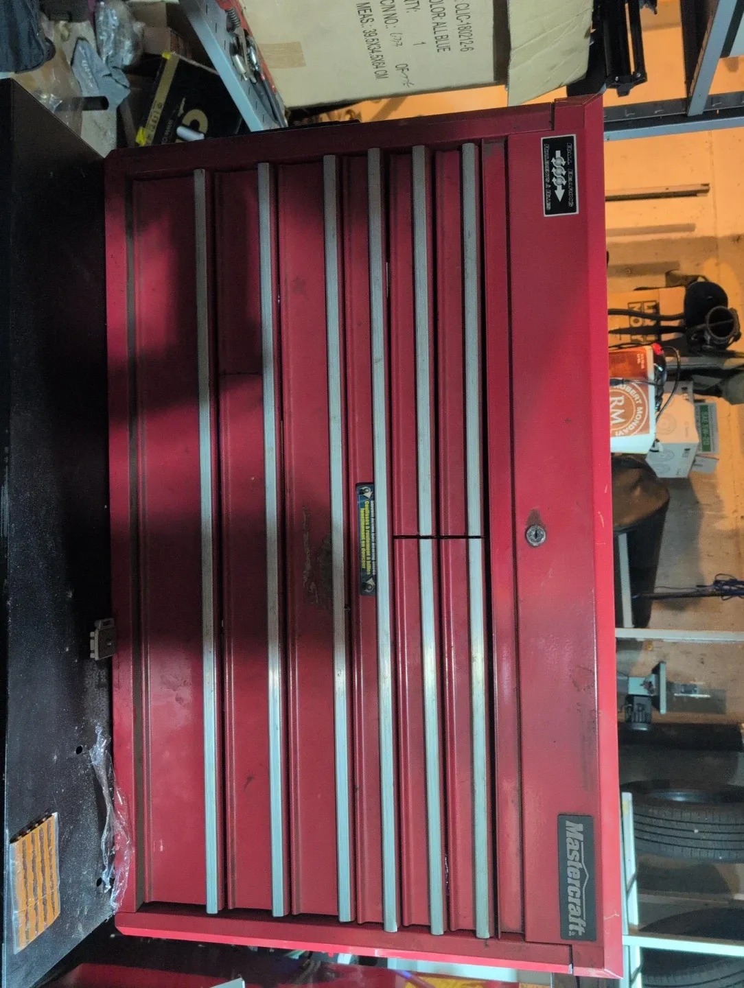 Selling a Mastercraft tool chest. It's red and has a number of drawers. It has some wear and tear but is still functional. Perfect for organizing your tools!