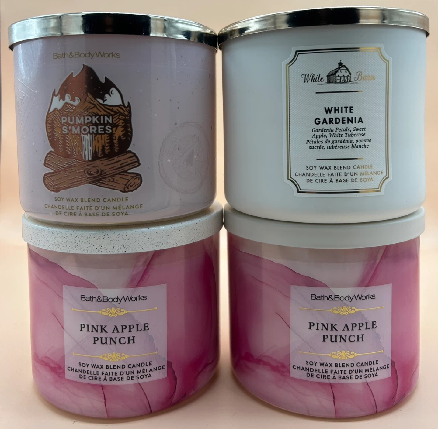 Selling a set of Bath & Body Works candles! Includes Pumpkin S'mores, White Gardenia, and two Pink Apple Punch candles. Perfect for creating a cozy atmosphere in your home