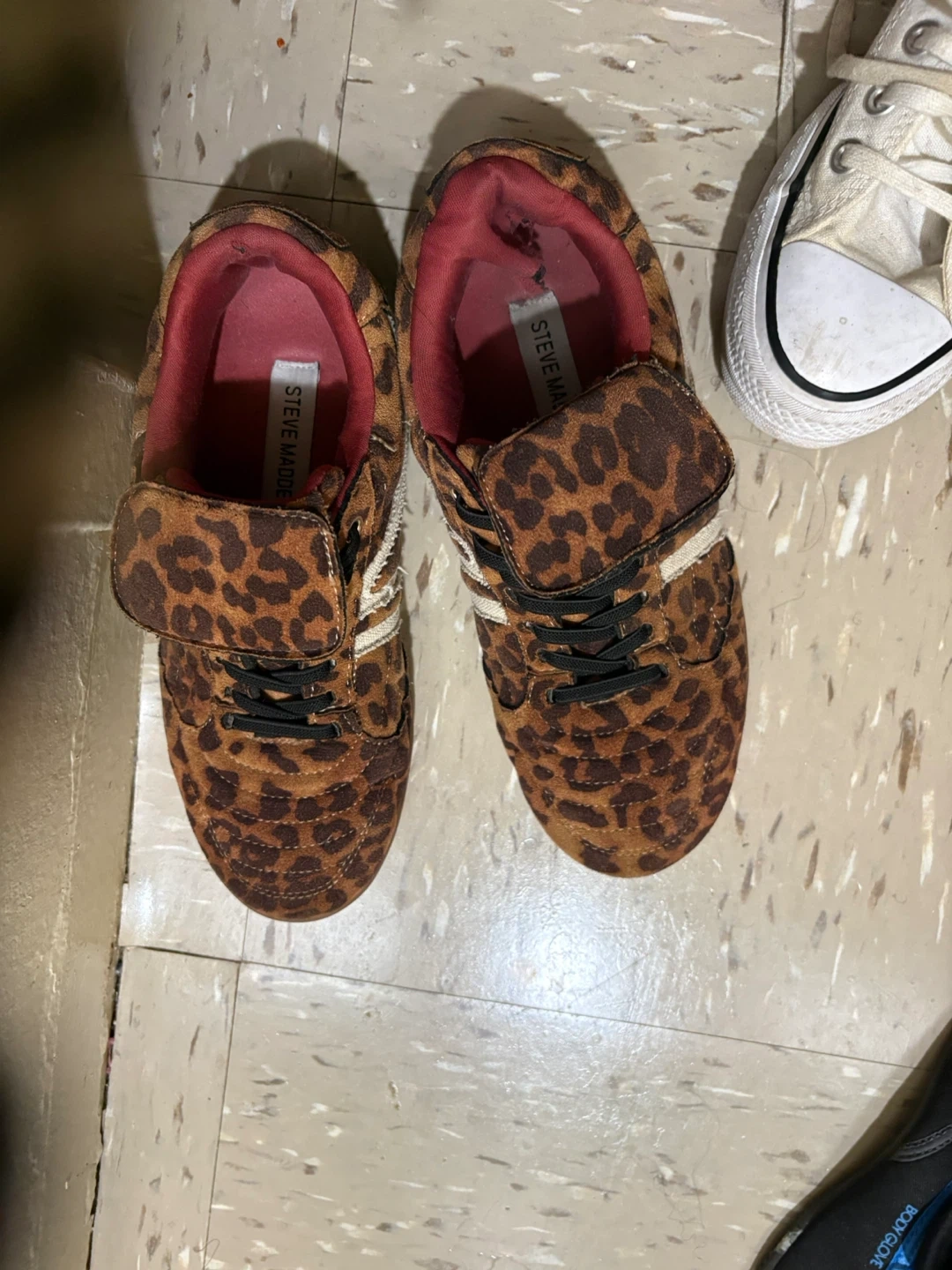 Free a pair of Steve Madden sneakers with a fun leopard print! They have black laces and a red interior. Perfect for adding a pop of style to your outfit