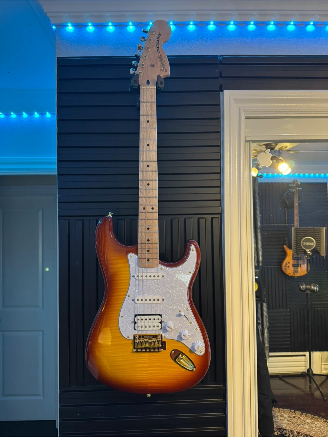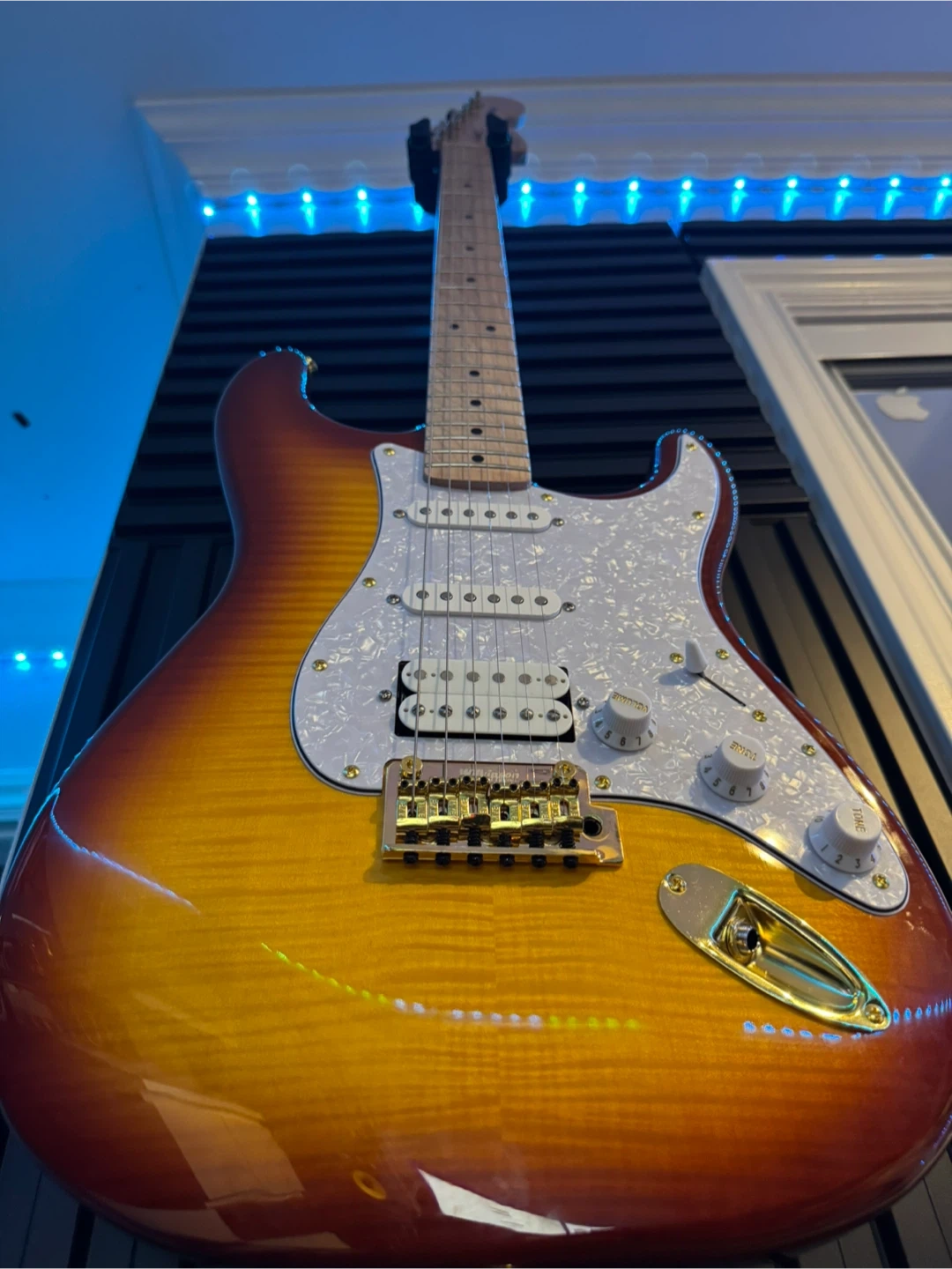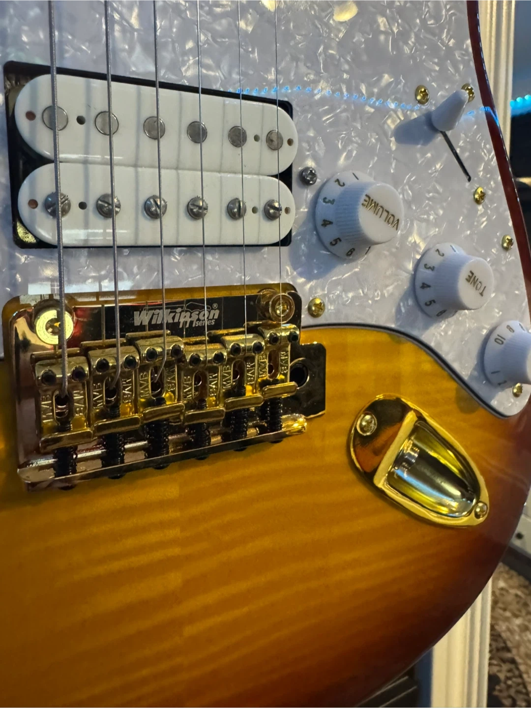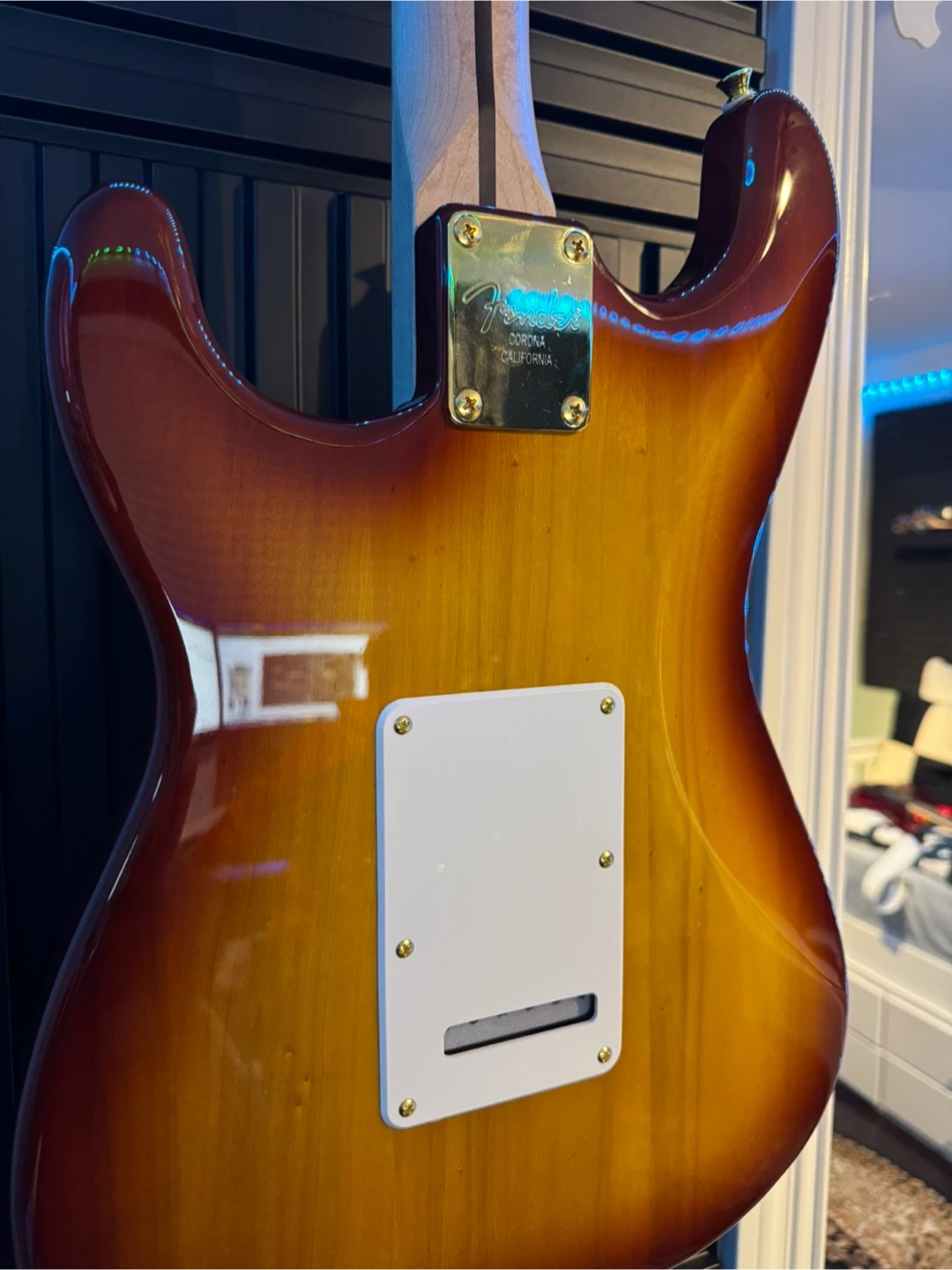 Selling a Fender Corona California Stratocaster. It's in great condition and ready to play! The guitar features a beautiful sunburst finish with gold hardware and a Wilkinson bridge. Perfect for any guitar enthusiast! 450