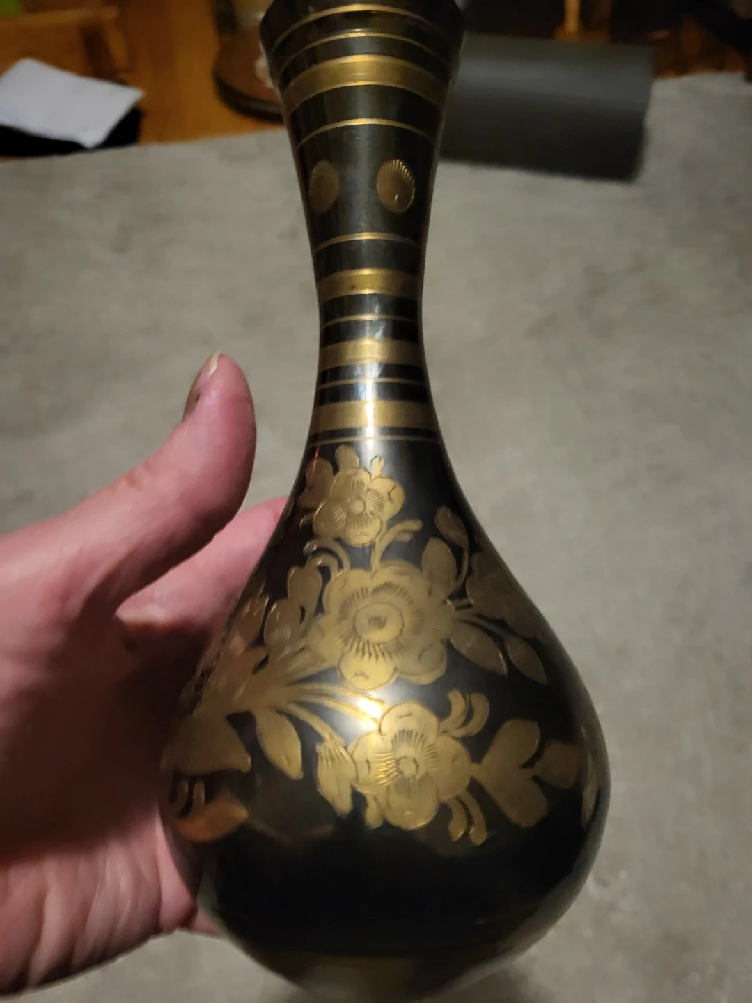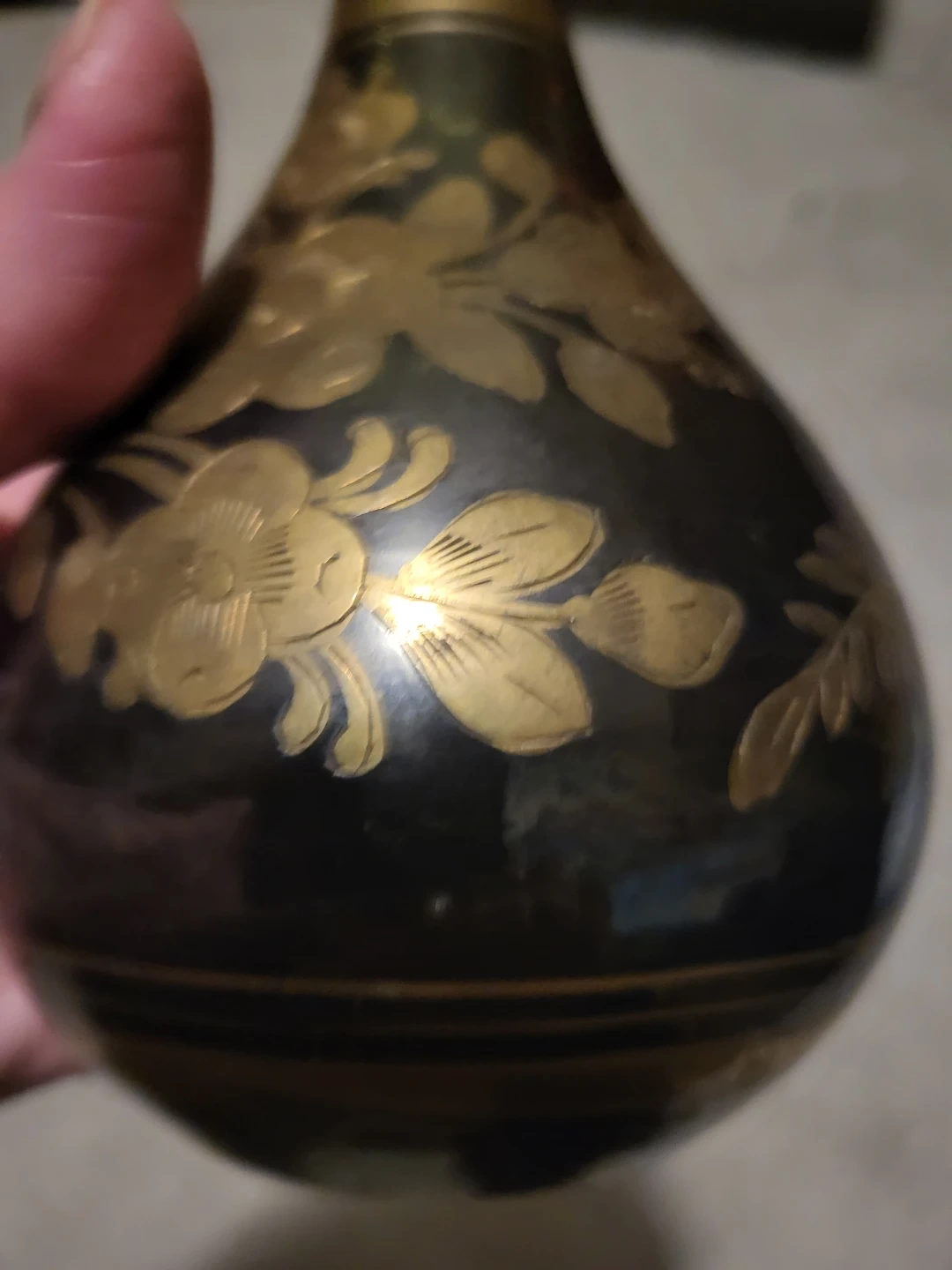 Selling a lovely vintage vase with a black and gold floral design. It has a unique shape and would look great as a decorative piece in any home. It's in good condition, ready to find a new home!
