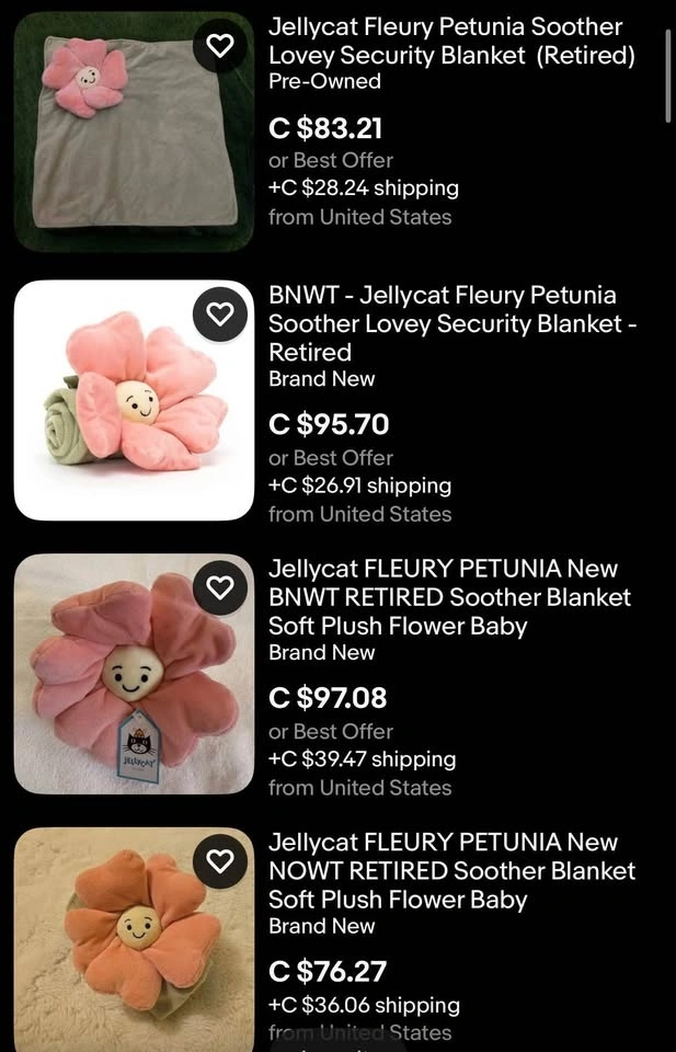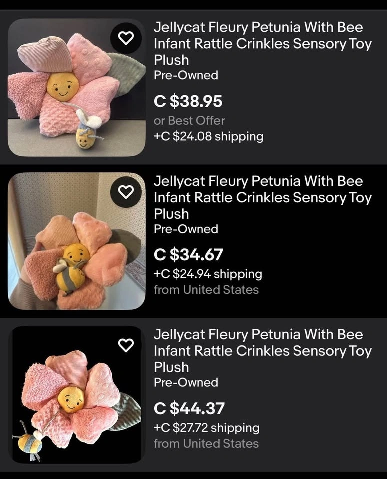 Buy & SellJellycat Fleury Petunia Soother Lovey & Rattle ToyJellycat Fleury Petunia Soother Lovey & Rattle Toy$40Jellycat Fleury Petunia Soother Lovey Security Blanket and rattle toy with bee. Both retired. Asking $80 for both.WHERE TO MEETHomeView MapSELLERKateWilloughby211 review0 chats·0 favorites·12 viewsSEND CHAT TO SELLERHi Kate! I’m interested in your listing.Hi Kate! I’m interested in your listing.Get the Karrot app to chatSign In to chat