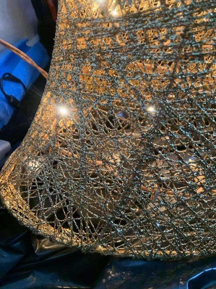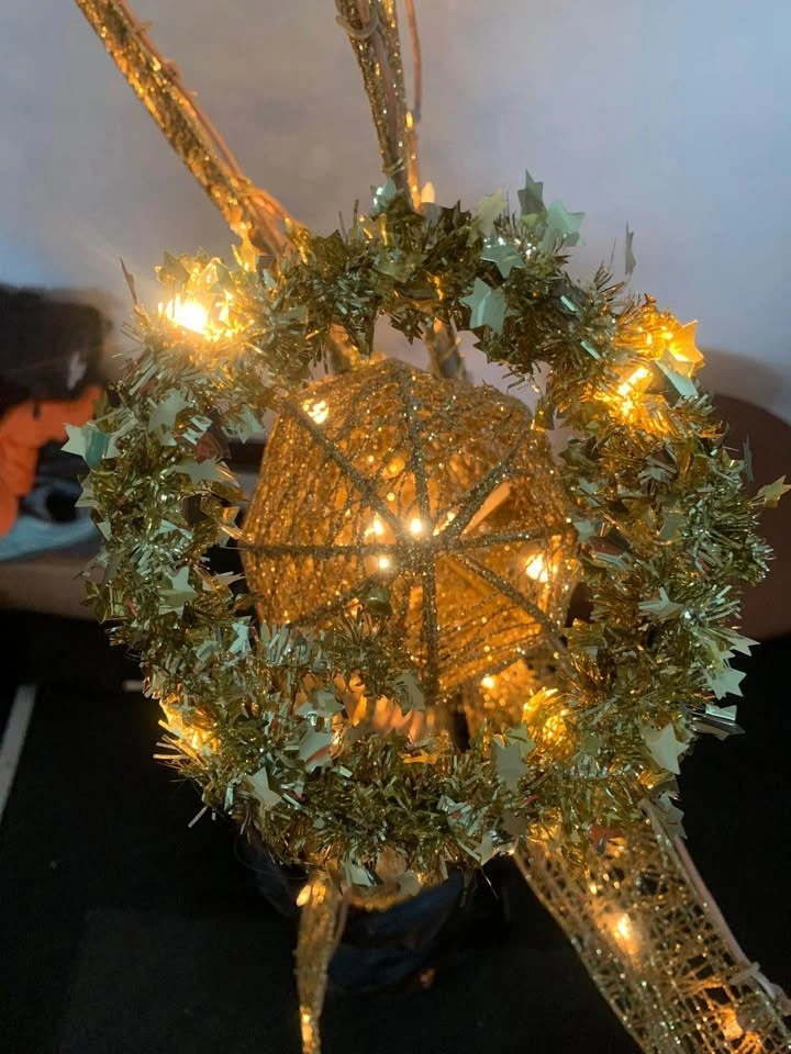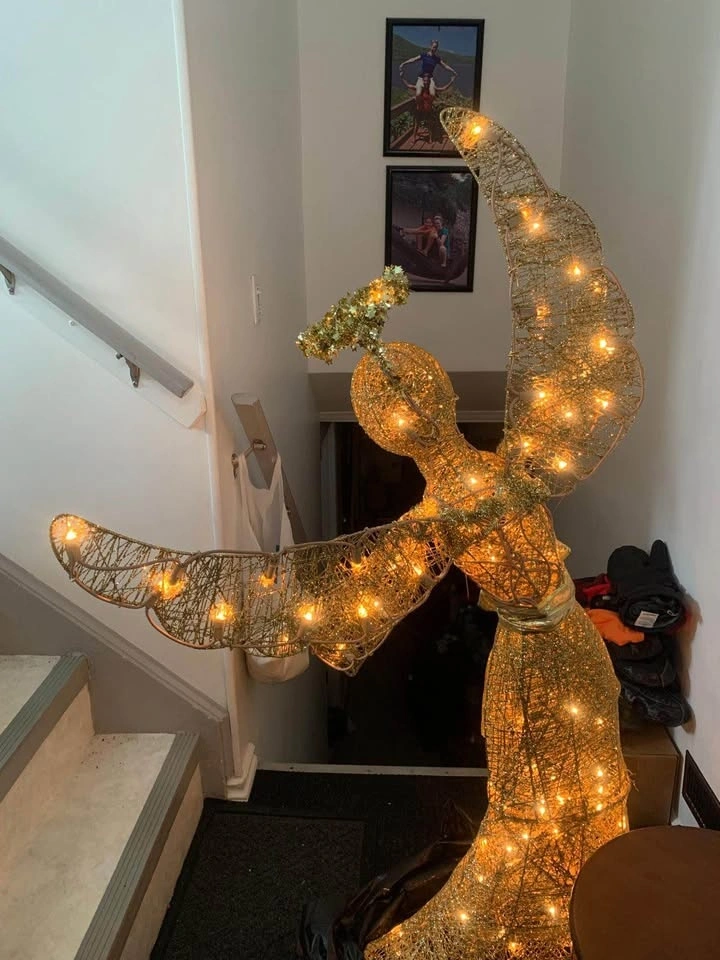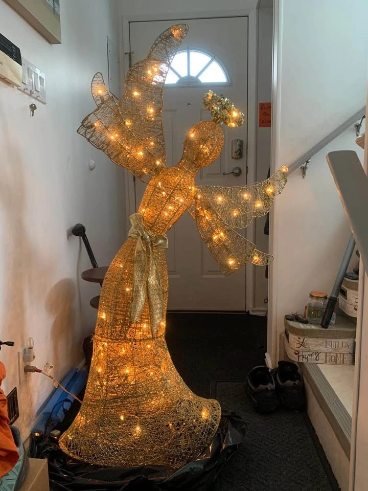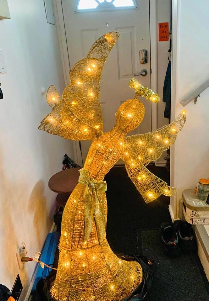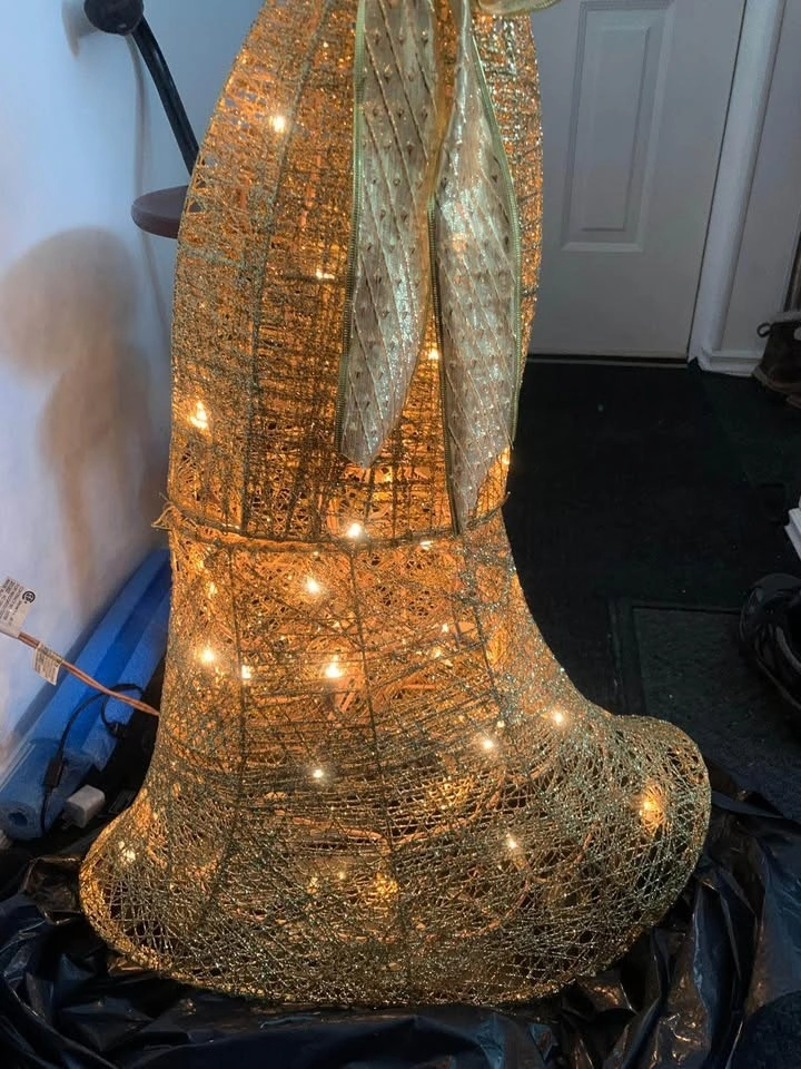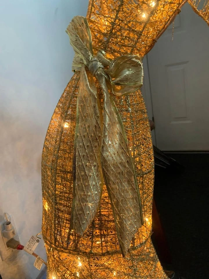 Gold angel decoration with lights. Has a ribbon around the waist and wings. Lights up with warm glow. Made of sparkly gold material. Good condition, some signs of use. About 4.5 feet in height, about 2 feet at widest point.