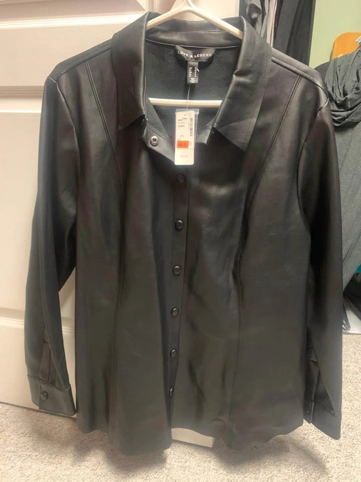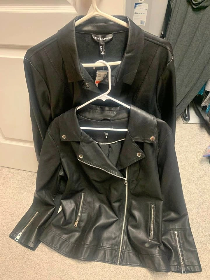 2 Ladies Pleather jackets, Size US 20 & 22. $70 for both. Pick up only in Dovercourt Community (Northwest Edmonton). From a smoke and pet free home. Black leather jacket with multiple zippers, has a collar and long sleeves. In good condition.
