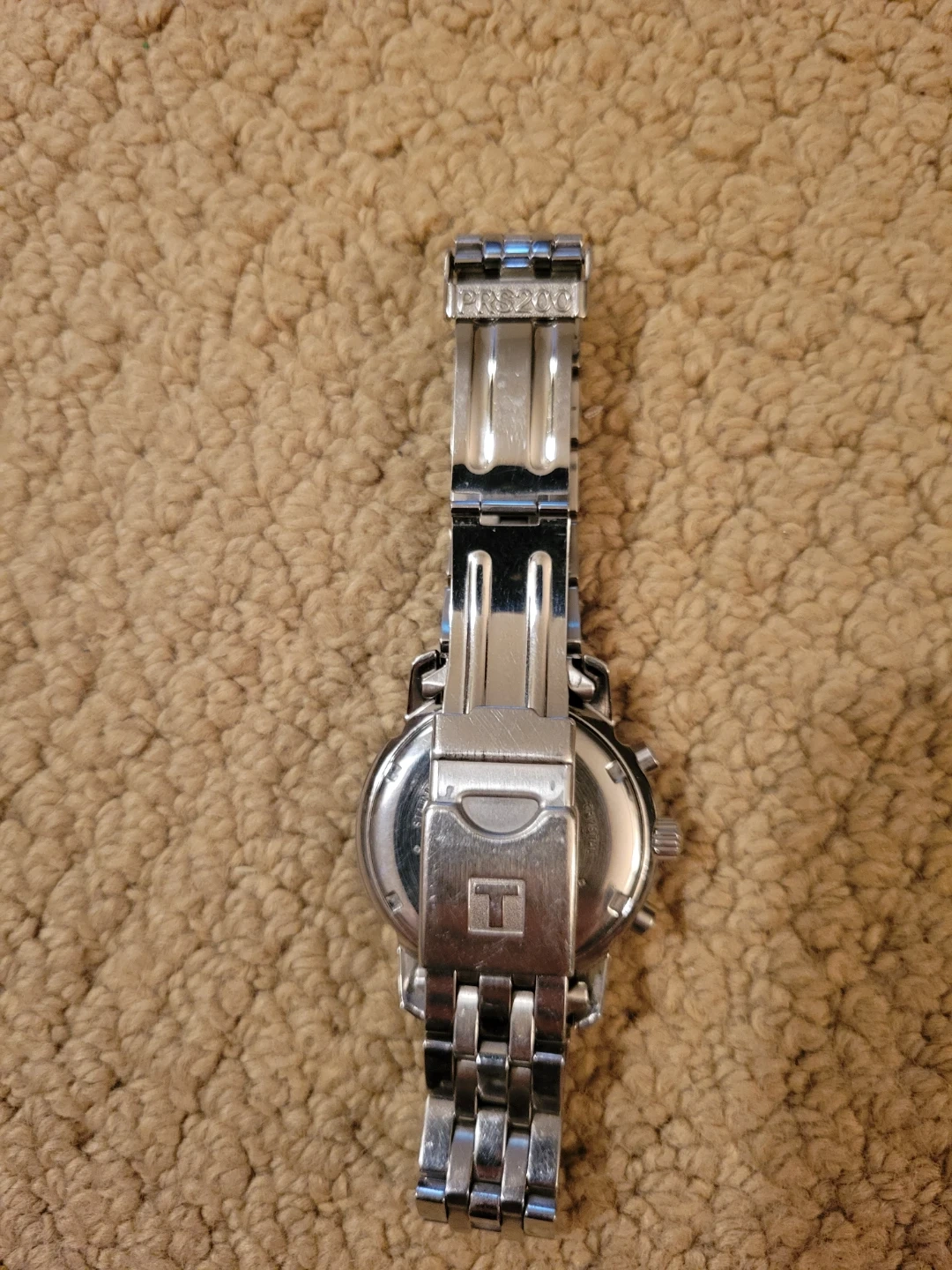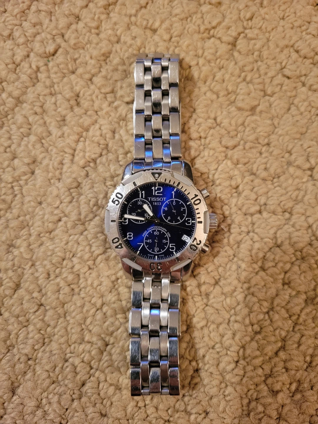 Selling a Tissot 1853 PRS200 Chronograph watch. It's a stylish timepiece with a stainless steel band and a striking blue face. The watch used but in good condition and ready for a new owner! Watch is approximately 25yrs old and I just had new battery put in at jewelry store.