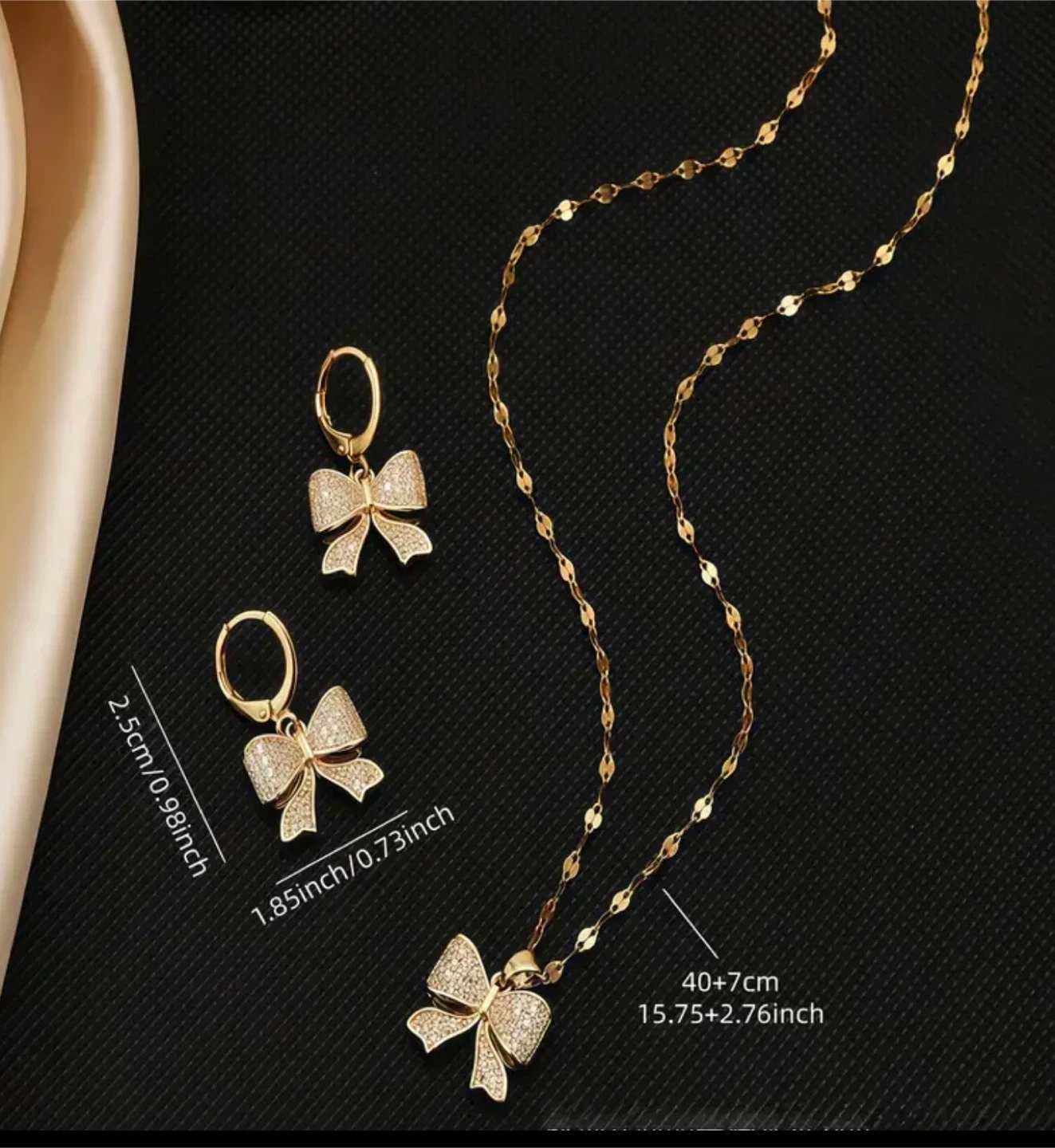 This is a very elegant gold bowknot necklace and earring set. The necklace is 15.75 + 2.76 inches long, and the earrings are 0.98 x 0.73 inches. Perfect for adding a touch of sparkle to any outfit!