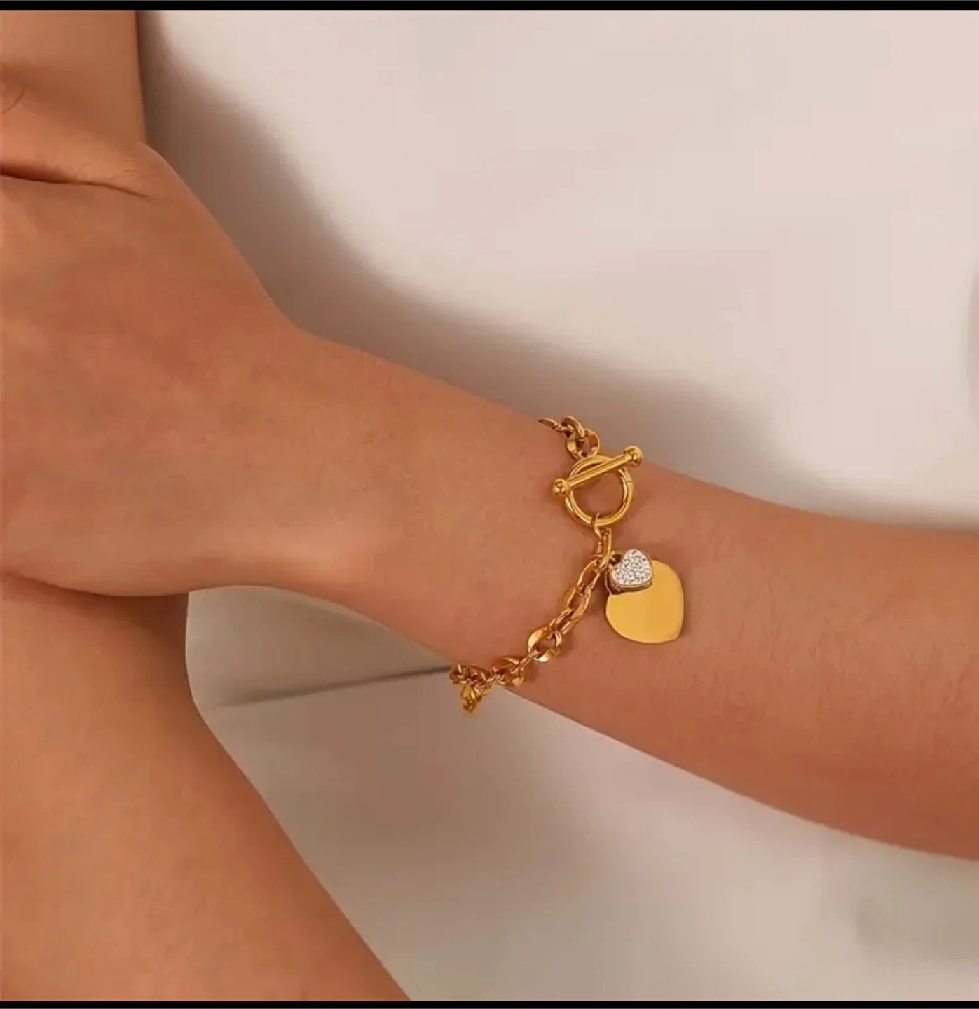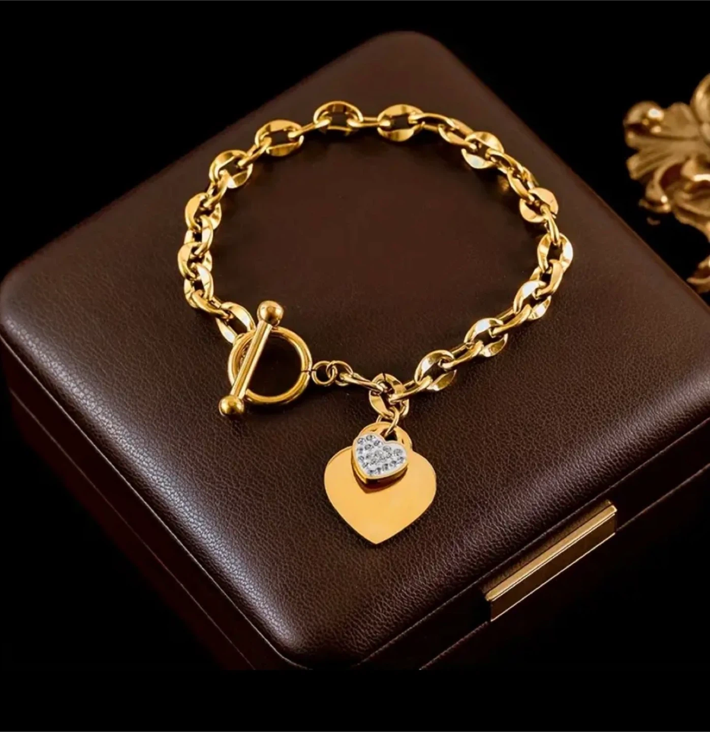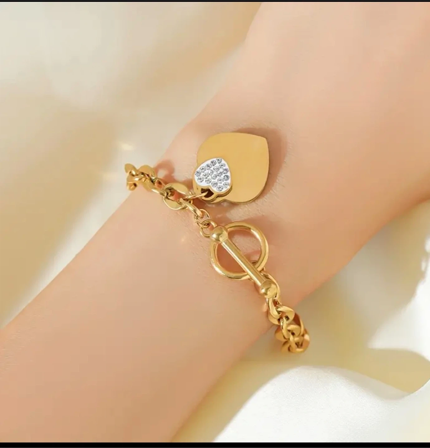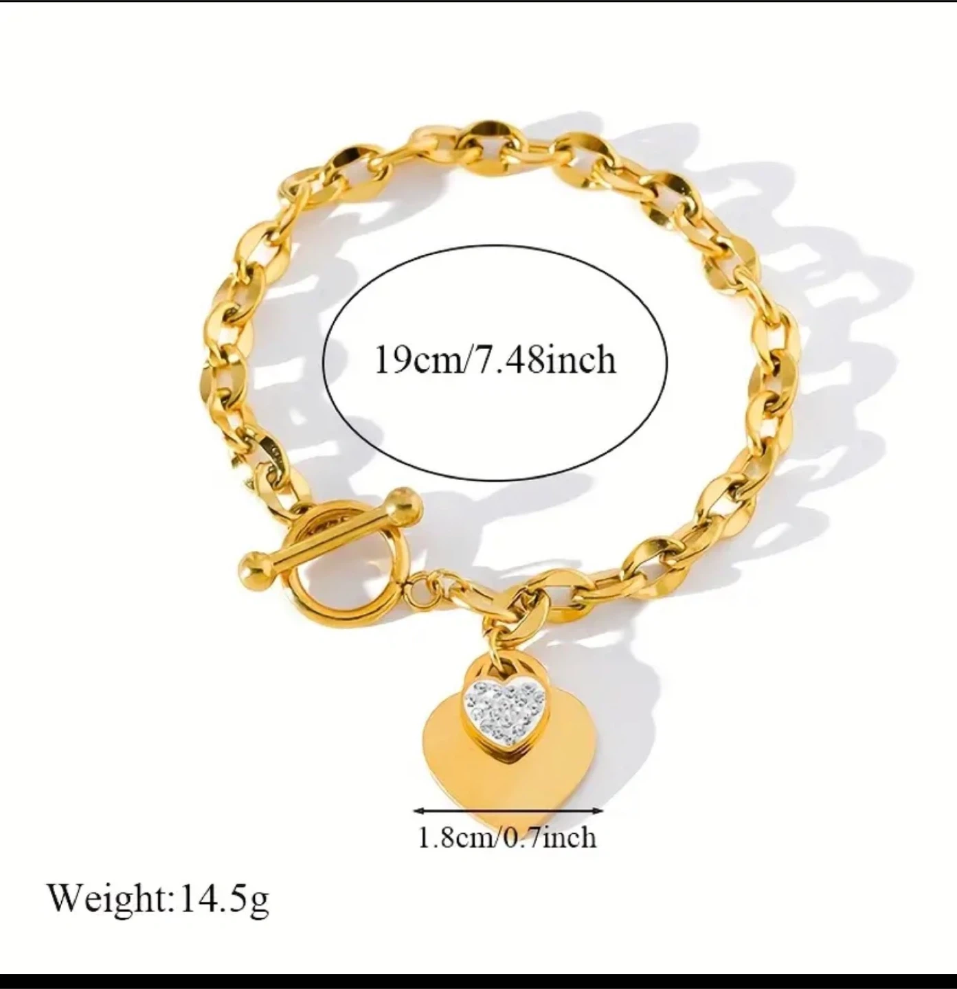 Selling a cute gold-toned bracelet! It's about 7.48 inches (19cm) long and features a heart charm with some sparkly accents. The heart charm is about 0.7 inches (1.8cm) in size. It's in great condition and would make a lovely addition to your jewelry collection