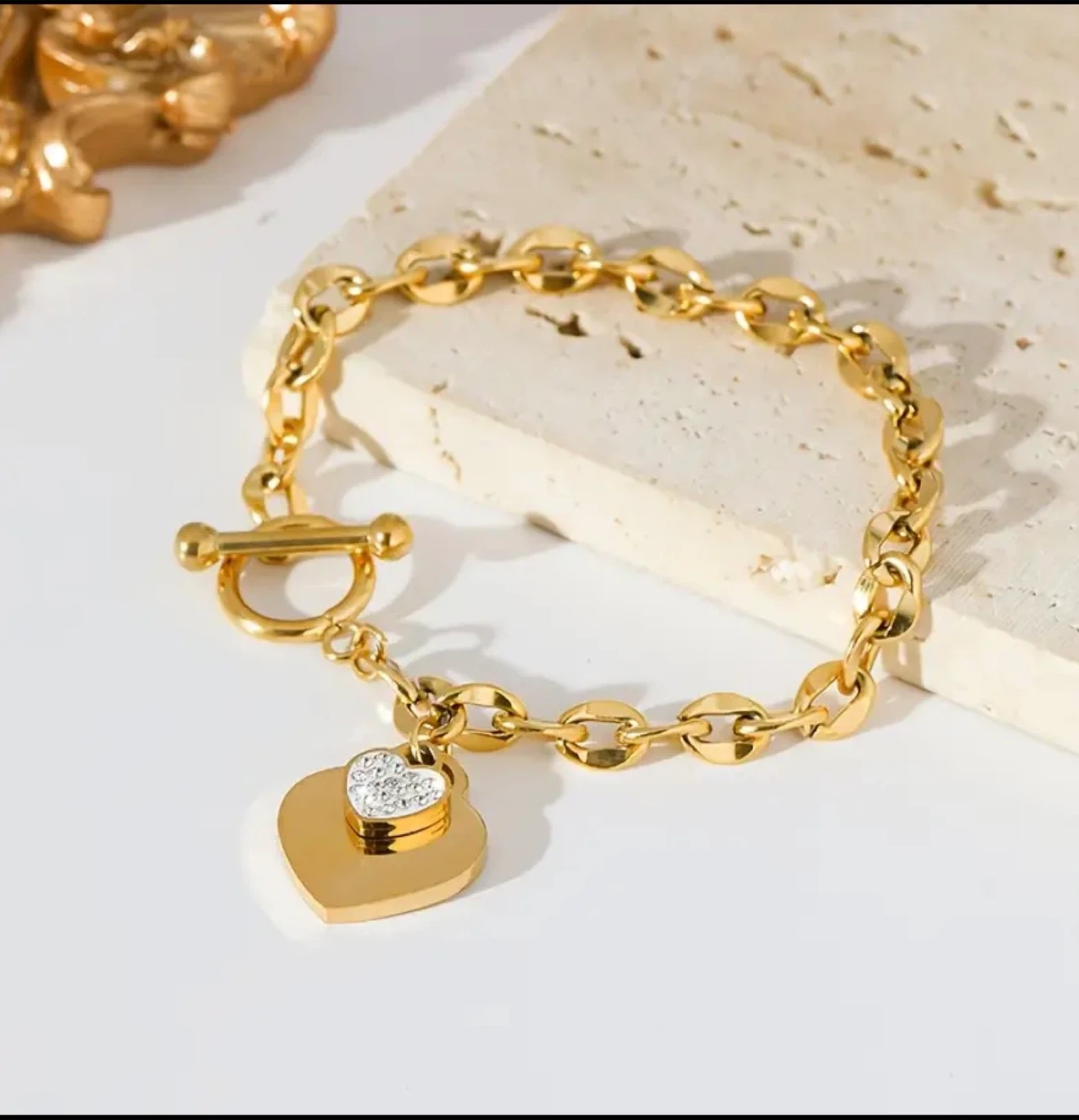 Selling a cute gold-toned bracelet! It's about 7.48 inches (19cm) long and features a heart charm with some sparkly accents. The heart charm is about 0.7 inches (1.8cm) in size. It's in great condition and would make a lovely addition to your jewelry collection