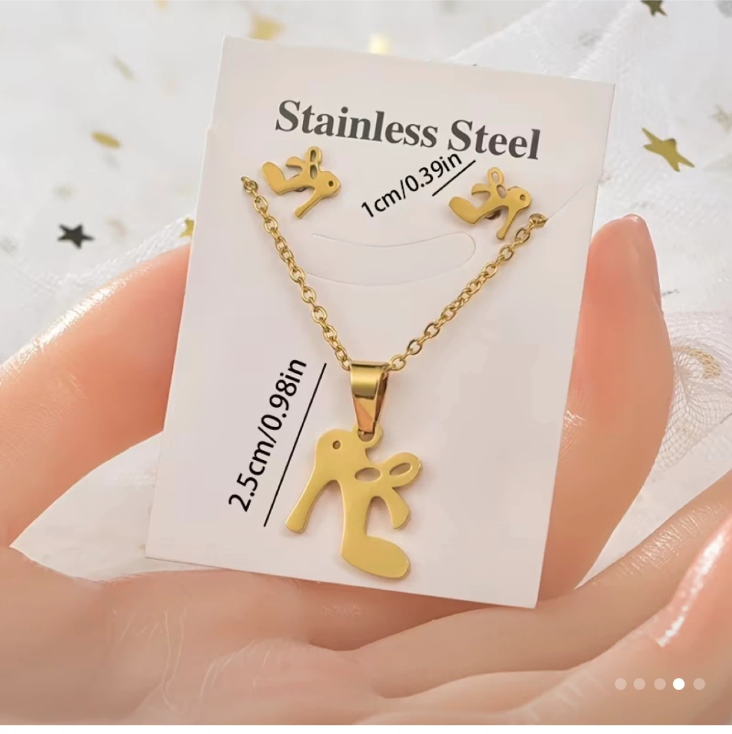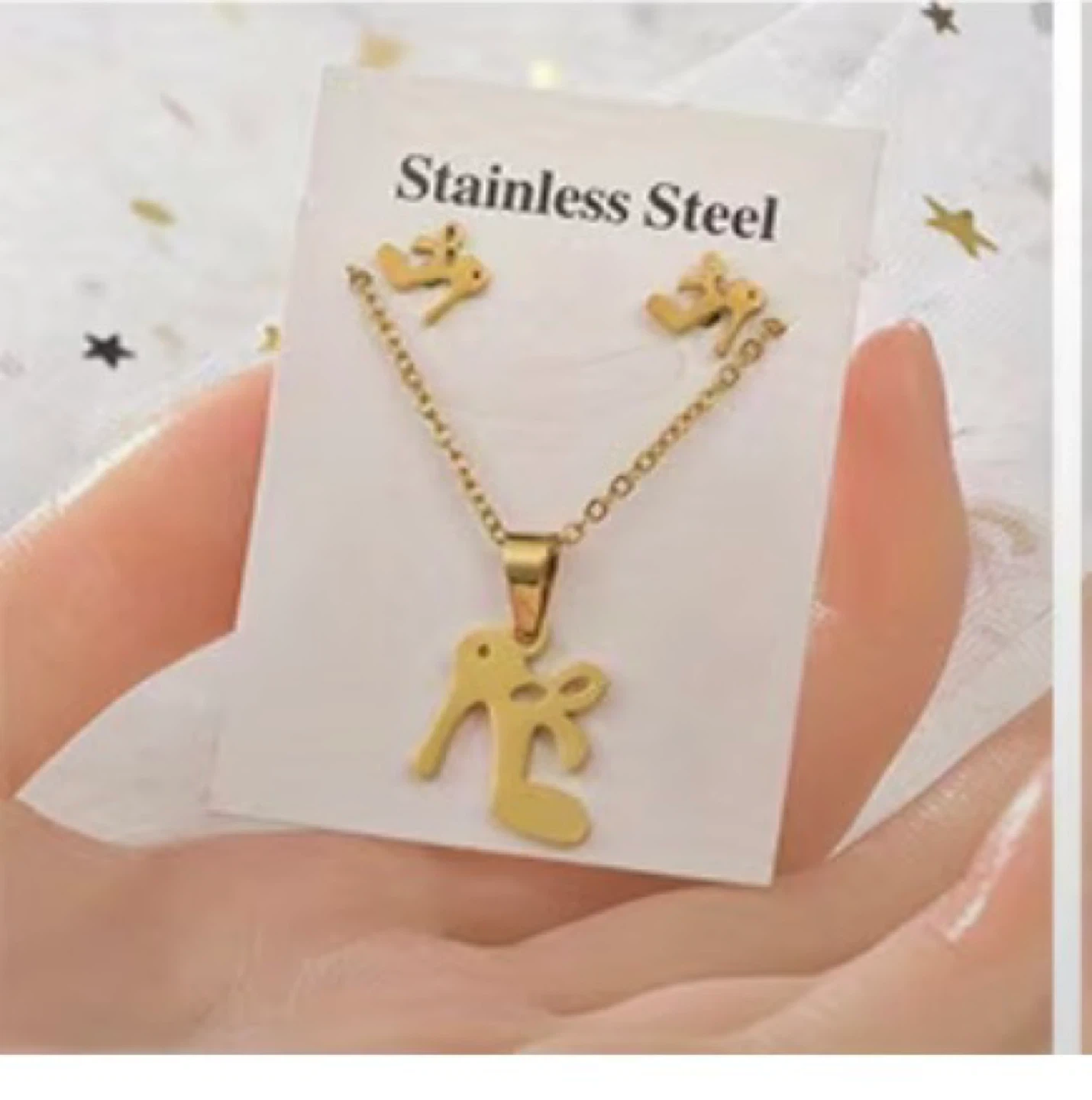 This is a cute stainless steel necklace and earring set. The set is gold-toned and features a unique design. The necklace pendant measures 2.5cm/0.98in and the earrings measure 1cm/0.39in
