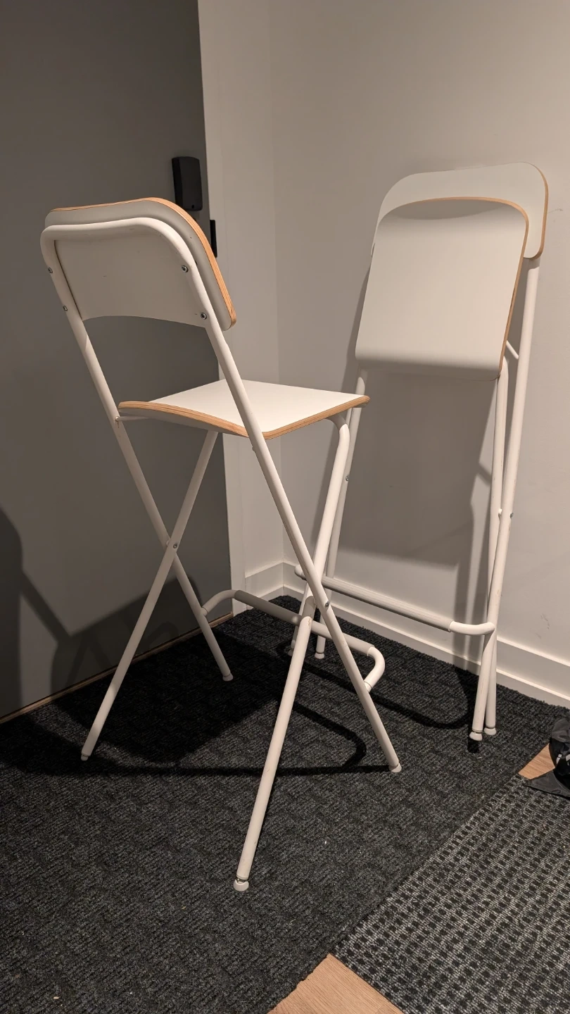 Two IKEA Franklin bar stools in white! They're foldable and easy to store. They seat is 29" high from the ground, taller than the current ones listed on IKEA. One leg on one of the chairs is missing the pad. Selling for 25 each or 40 for both