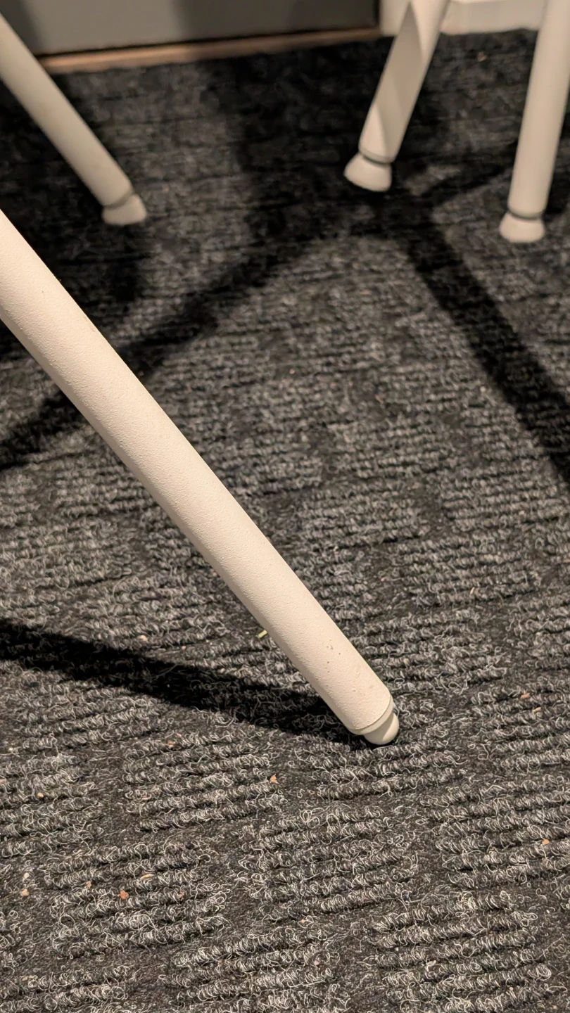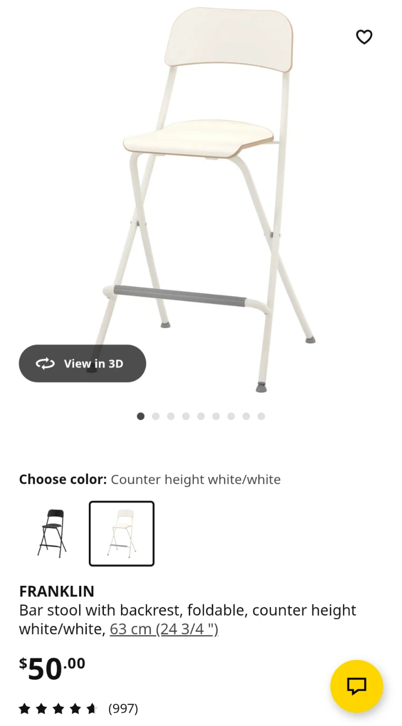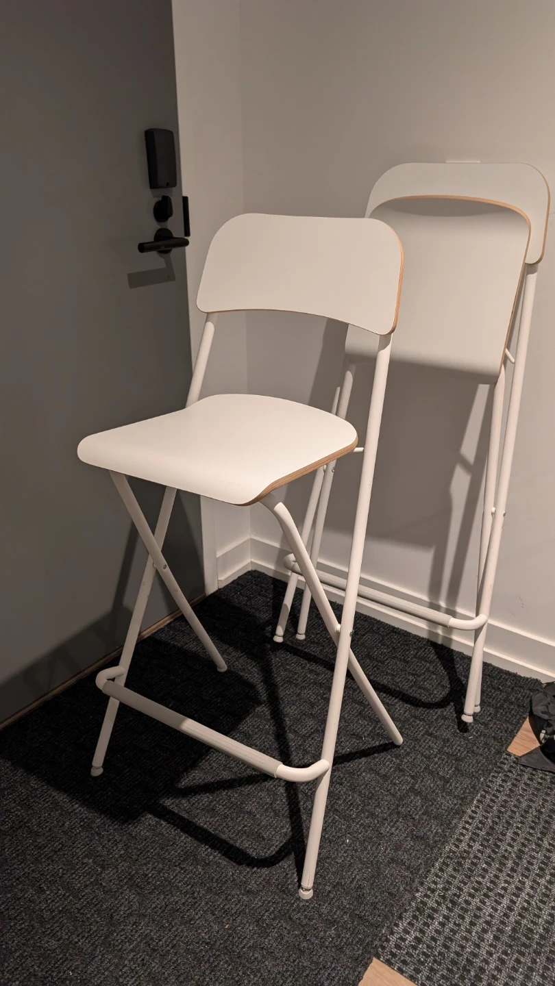 Two IKEA Franklin bar stools in white! They're foldable and easy to store. They seat is 29" high from the ground, taller than the current ones listed on IKEA. One leg on one of the chairs is missing the pad. Selling for 25 each or 40 for both