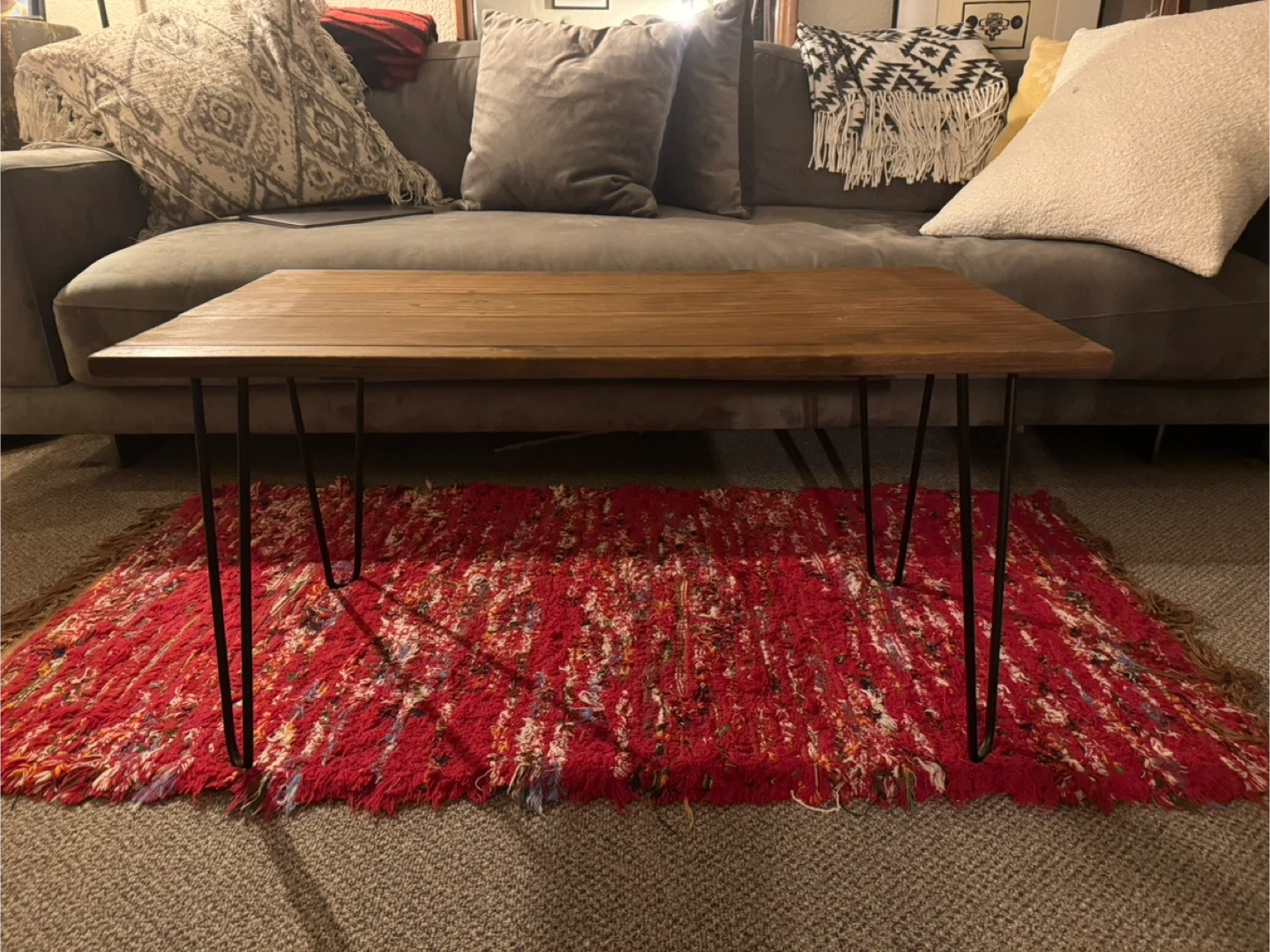 Selling a wooden (Douglas fir) coffee table with black hairpin legs. It's in great shape and would look great in any living room or den