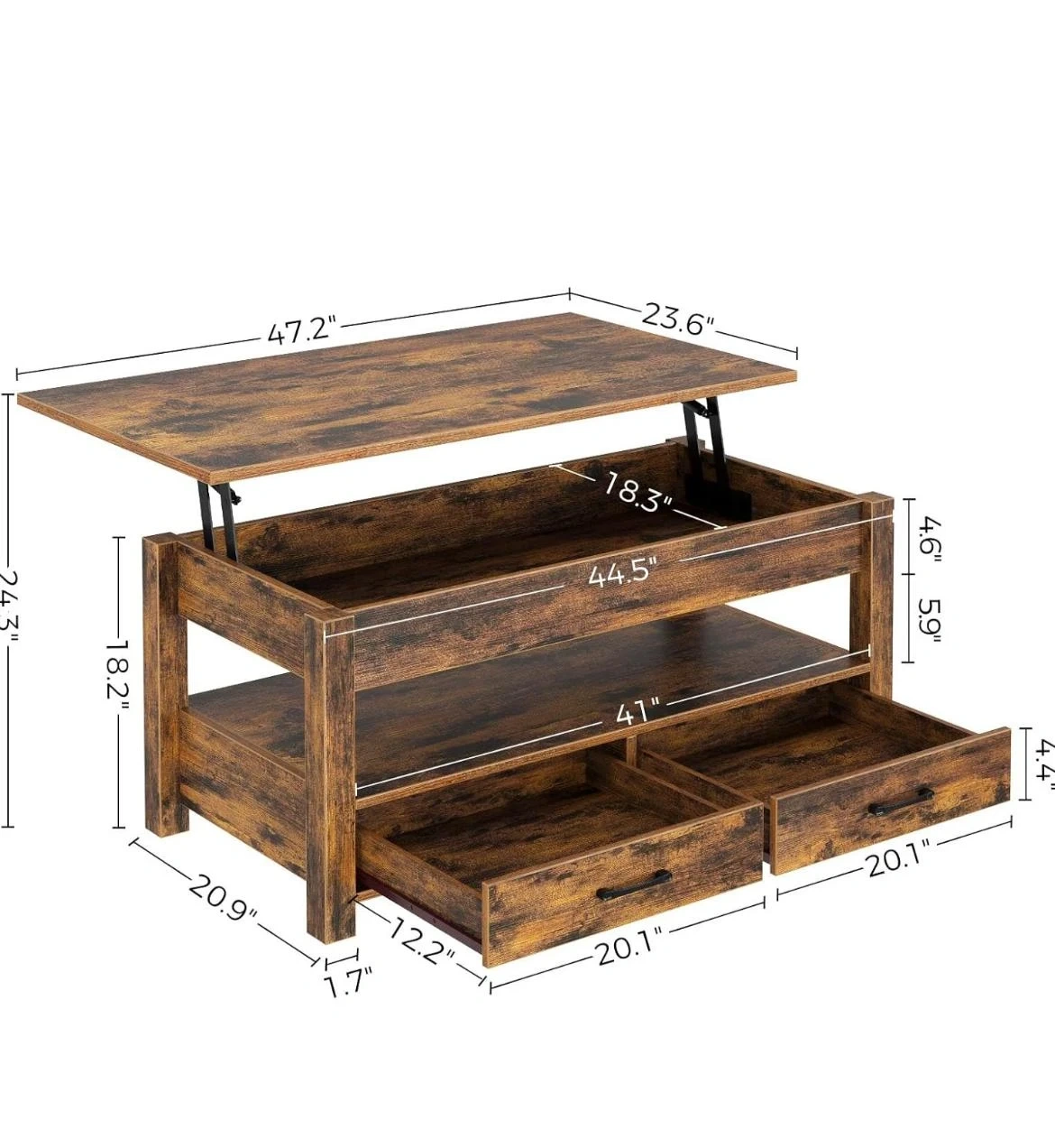This coffee table is perfect for adding storage and functionality to your living room! It features a lift-top design with hidden storage underneath, plus two drawers for extra organization. The dimensions are approximately 47.2" x 23.6" on top, with a height of 24.3". It's a great piece to keep things tidy and accessible