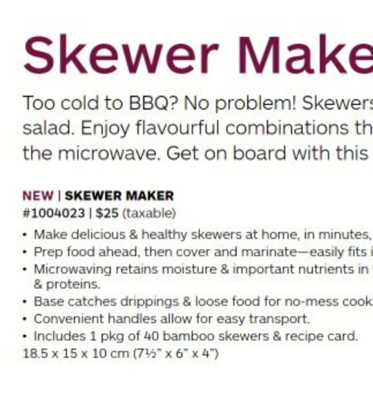 The skewer maker is perfect for making delicious and healthy skewers at home in minutes, even when it's too cold to BBQ. The base catches drippings and loose food for no-mess cooking. It measures 18.5 x 15 x 10 cm (7½" x 6" x 4").