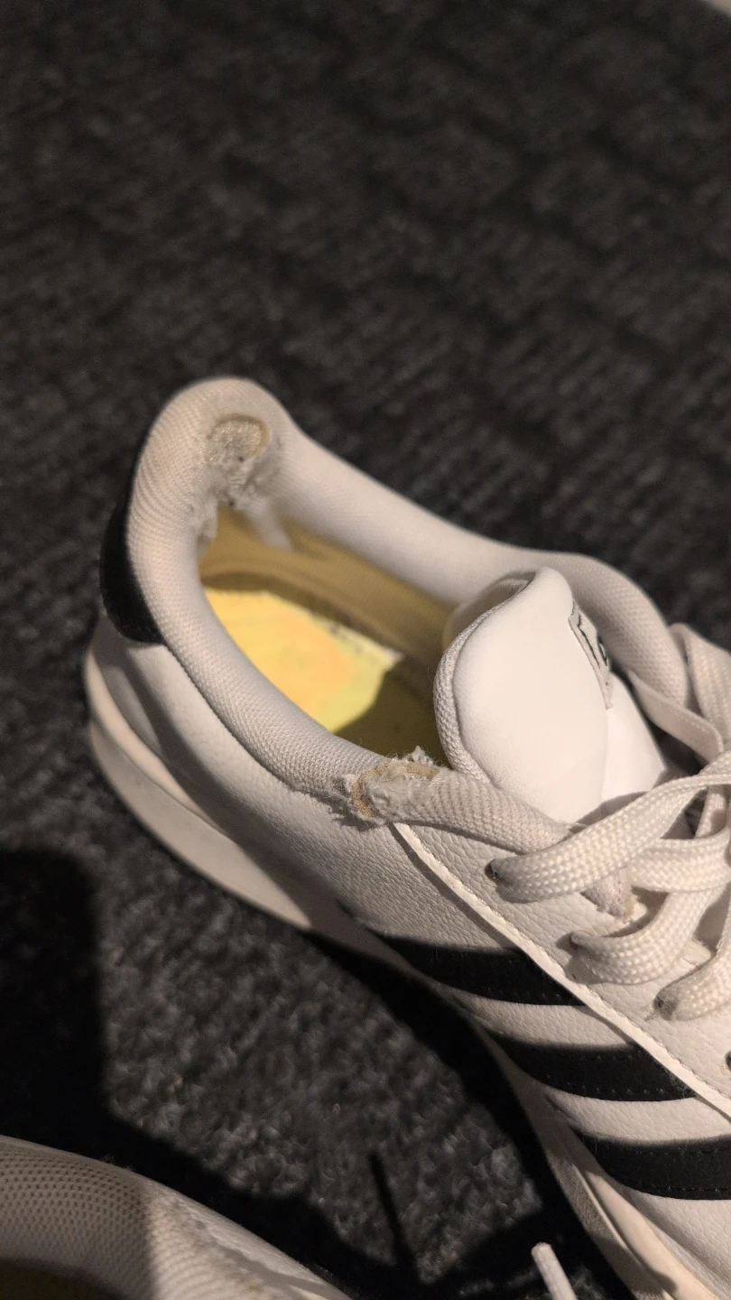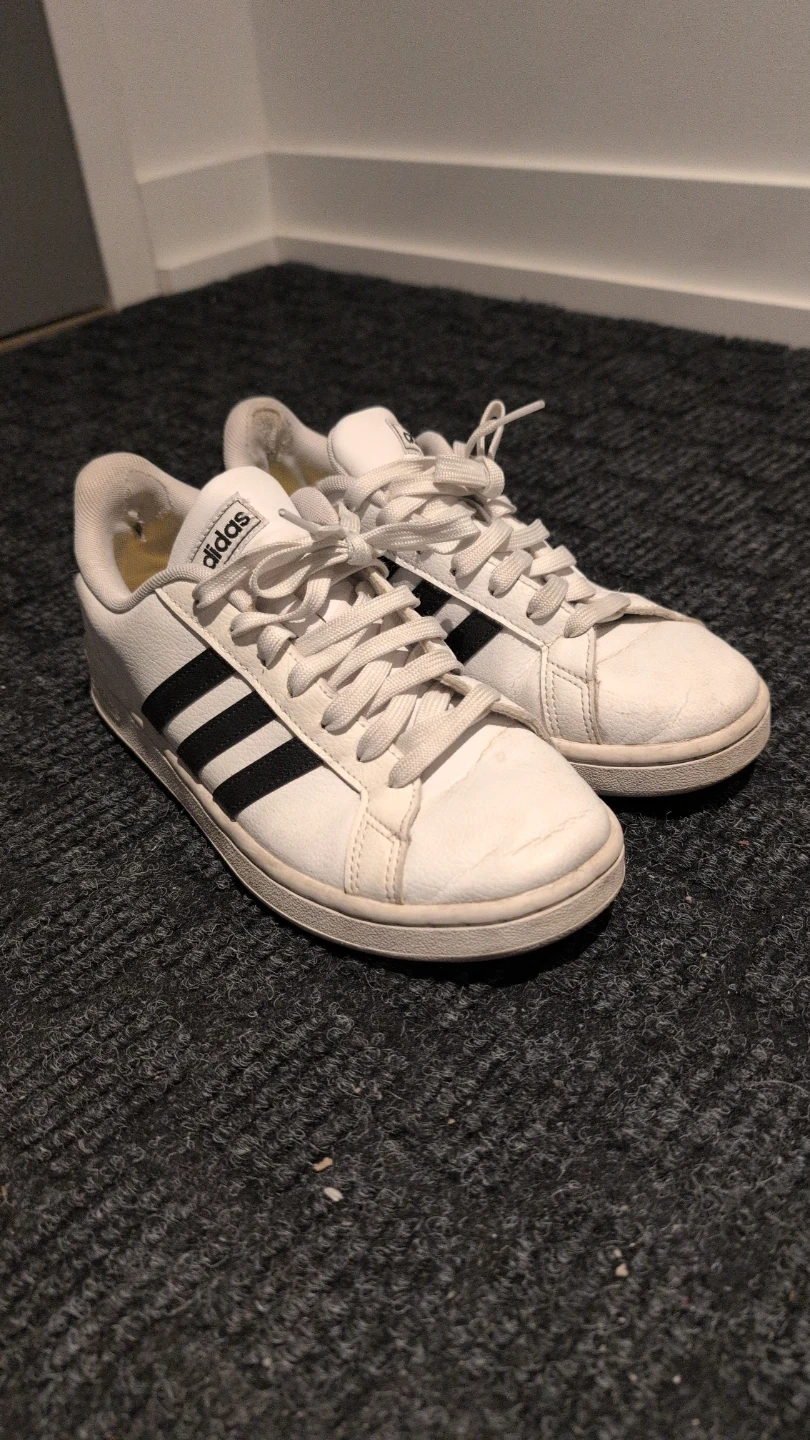 Selling a pair of Adidas Grand Court 2.0 women's shoes. They are white with black stripes. There are signs of wear, as shown in the photos, including some tearing and discoloration on the inside of the shoe. The soles also show wear. Size 7.5 US but fits loose like an 8. Removed soles because i wore insoles.