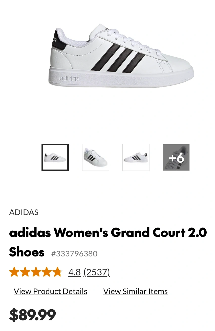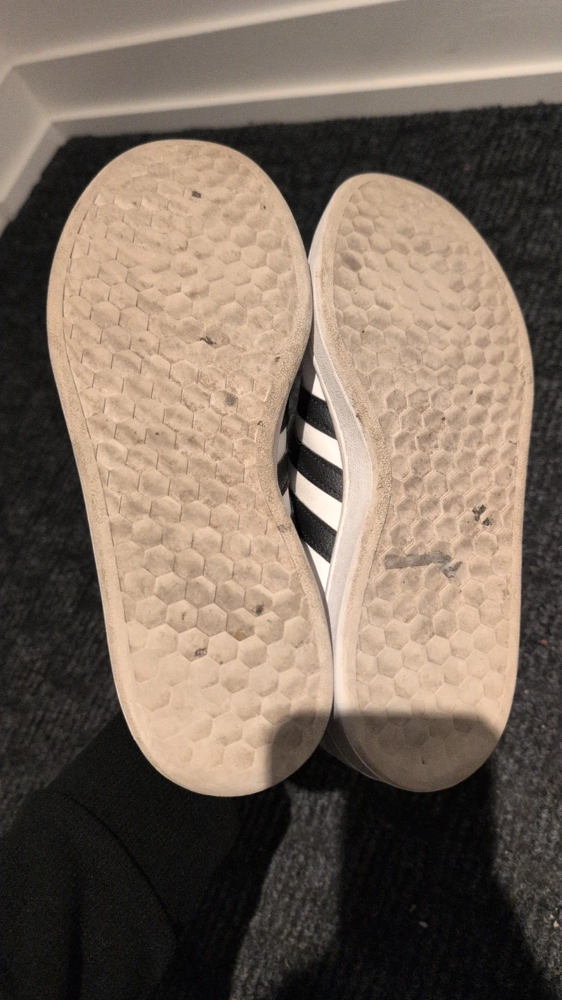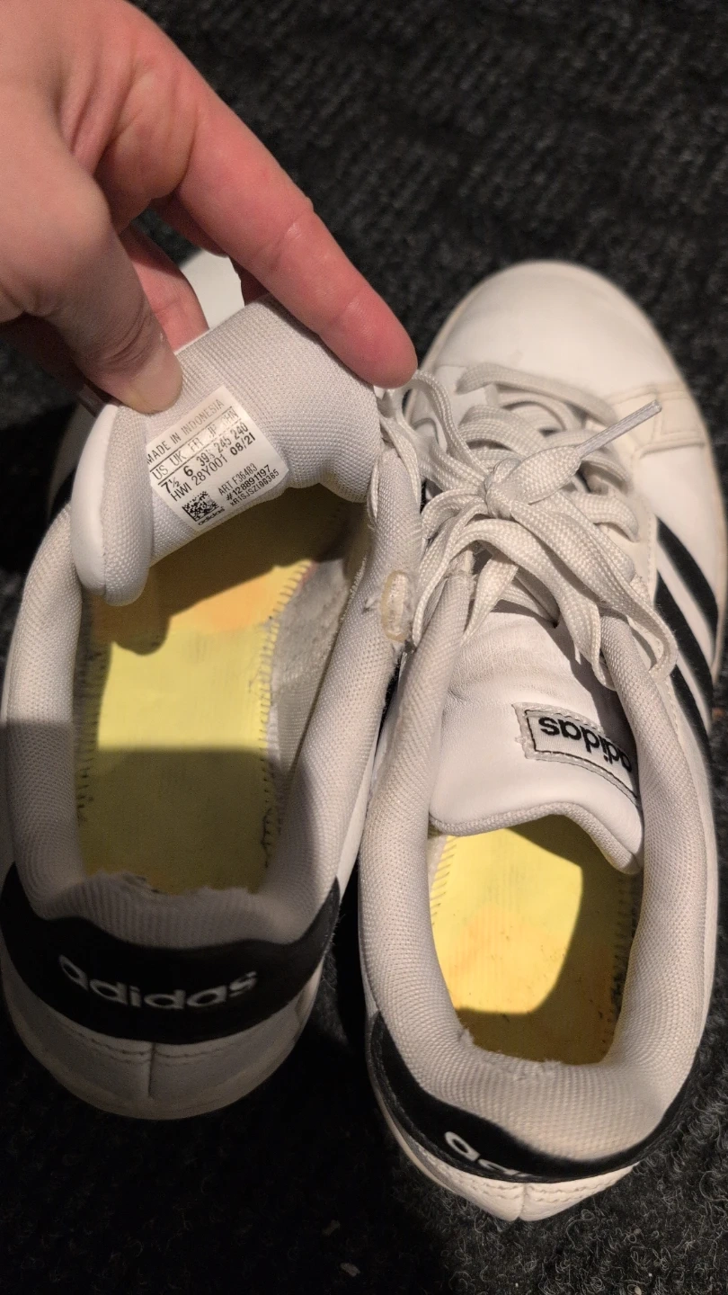 Selling a pair of Adidas Grand Court 2.0 women's shoes. They are white with black stripes. There are signs of wear, as shown in the photos, including some tearing and discoloration on the inside of the shoe. The soles also show wear. Size 7.5 US but fits loose like an 8. Removed soles because i wore insoles.