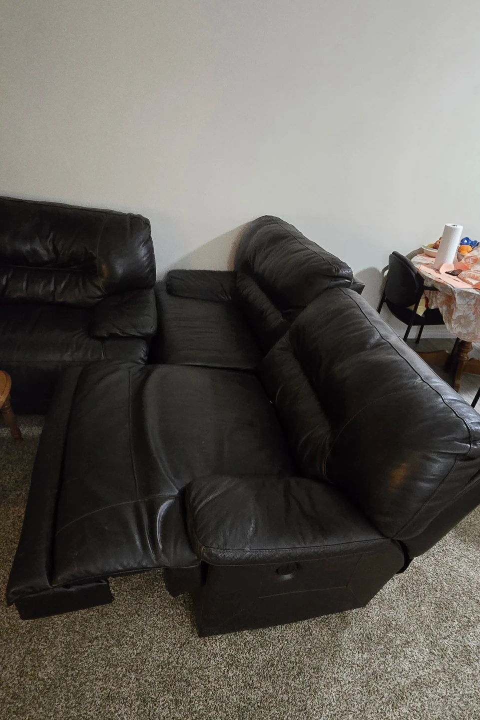Selling a comfortable brown leather reclining sofa set. It's in good condition and perfect for a living room or entertainment area. The set features a reclining function for ultimate relaxation. It's a great addition to any home!