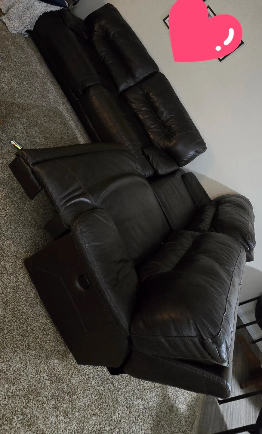 Selling a comfortable brown leather reclining sofa set. It's in good condition and perfect for a living room or entertainment area. The set features a reclining function for ultimate relaxation. It's a great addition to any home!