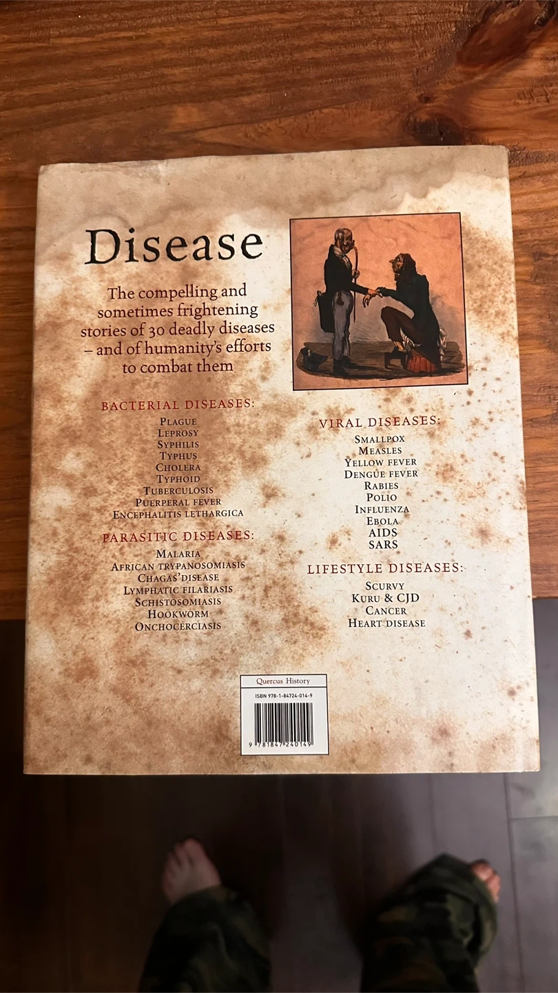 Book: Disease - The extraordinary stories behind history's deadliest killers. Written by Mary Dobson. It tells the compelling and sometimes frightening stories of 30 deadly diseases and of humanity's efforts to combat them. It covers bacterial, viral, and parasitic diseases, as well as lifestyle diseases like scurvy, Kuru & CJD, and cancer