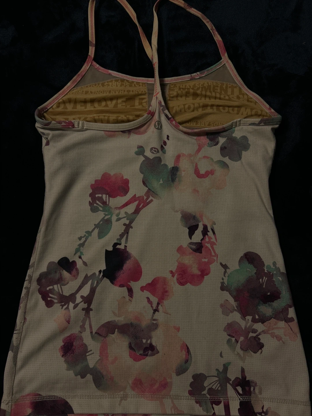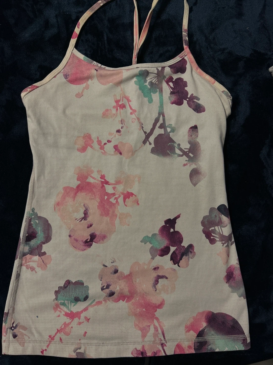 Selling a Lululemon tank top with a pretty floral pattern! It's in great condition and perfect for workouts or casual wear. The material is lightweight and comfortable, making it ideal for any activity. Feel free to reach out if you have any questions!