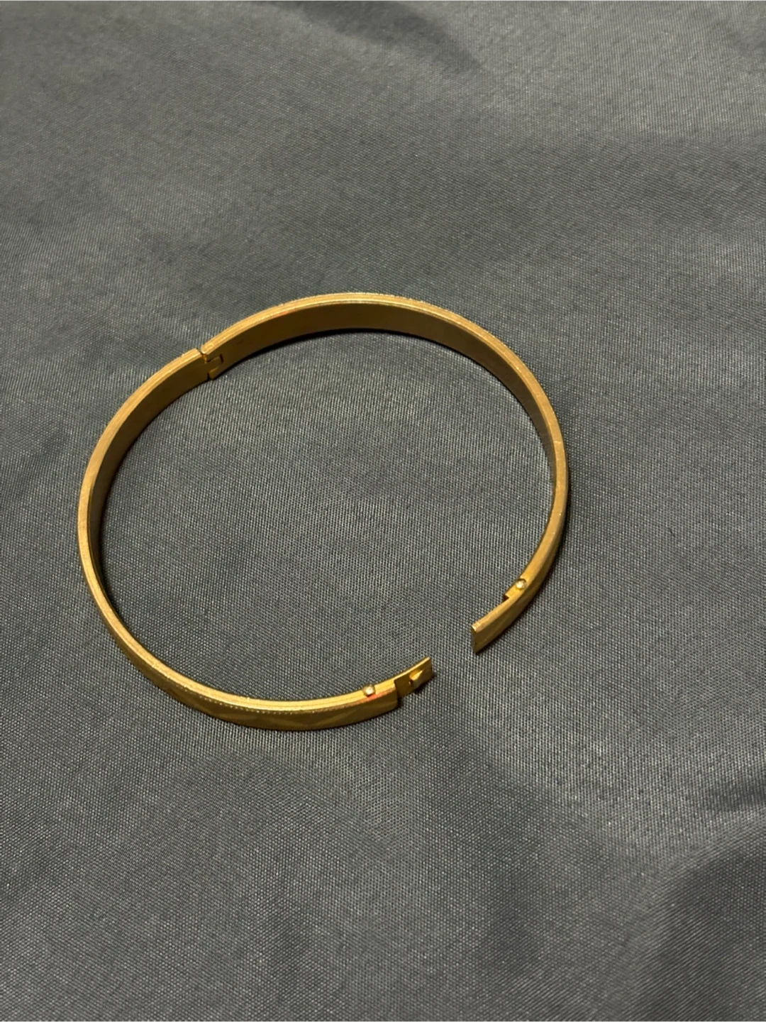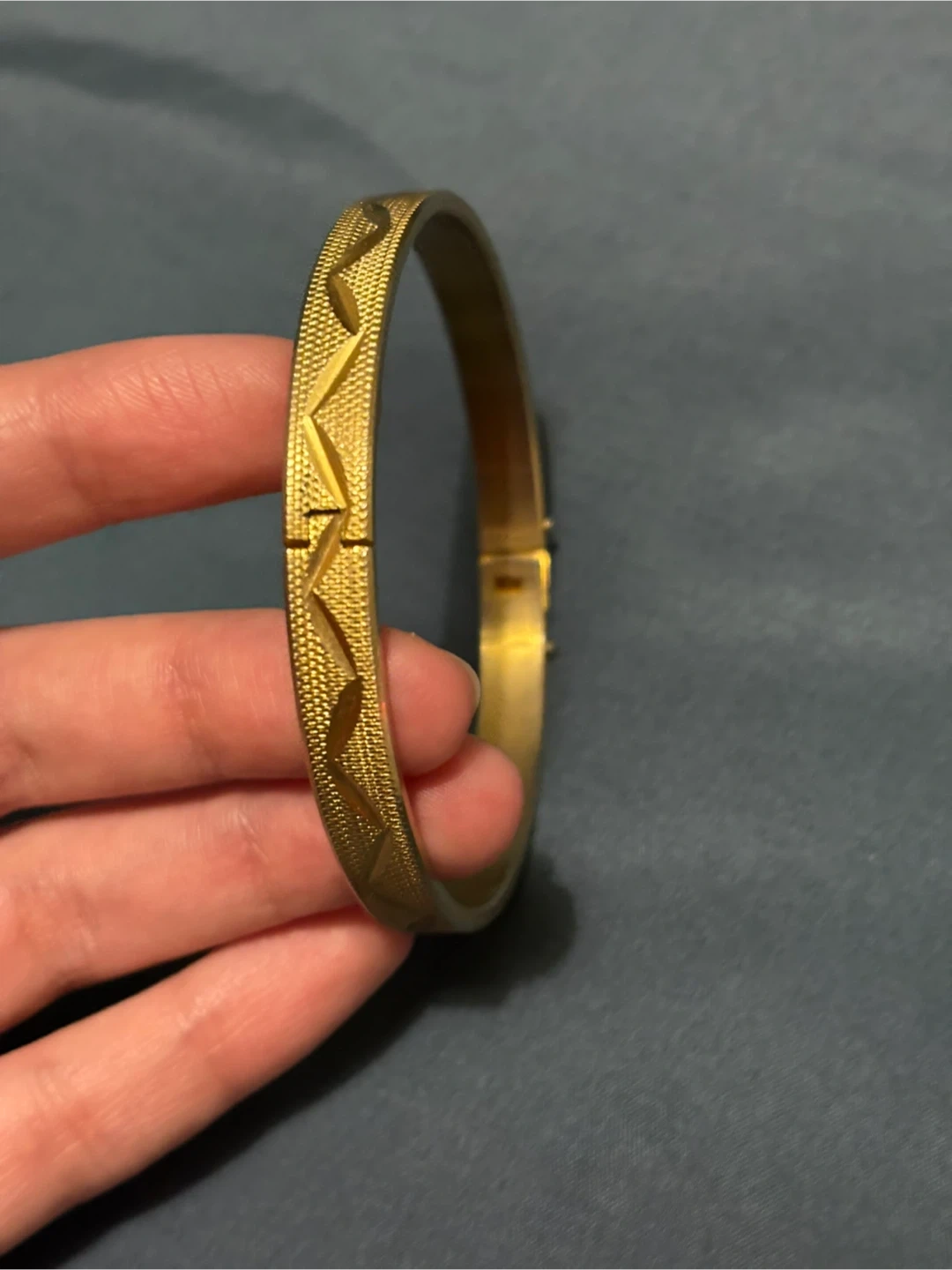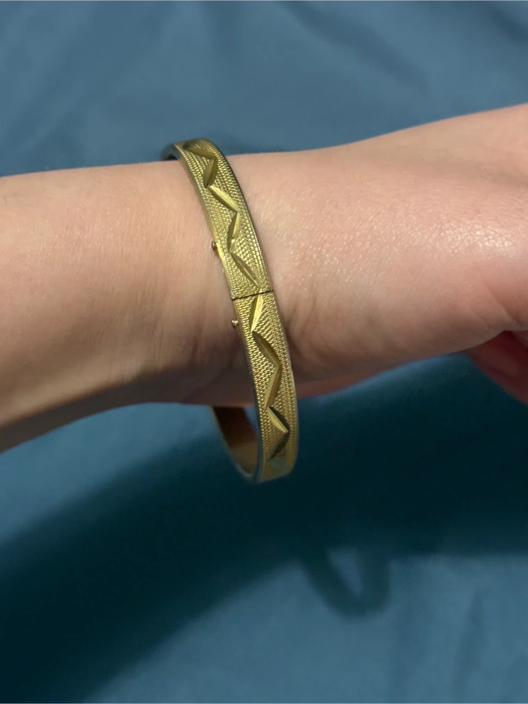 Selling a gold-toned bangle bracelet. It has a unique textured design and is in good condition. It's a stylish piece to add to your accessories!