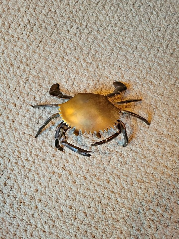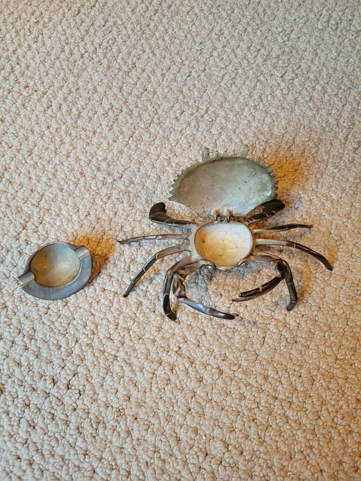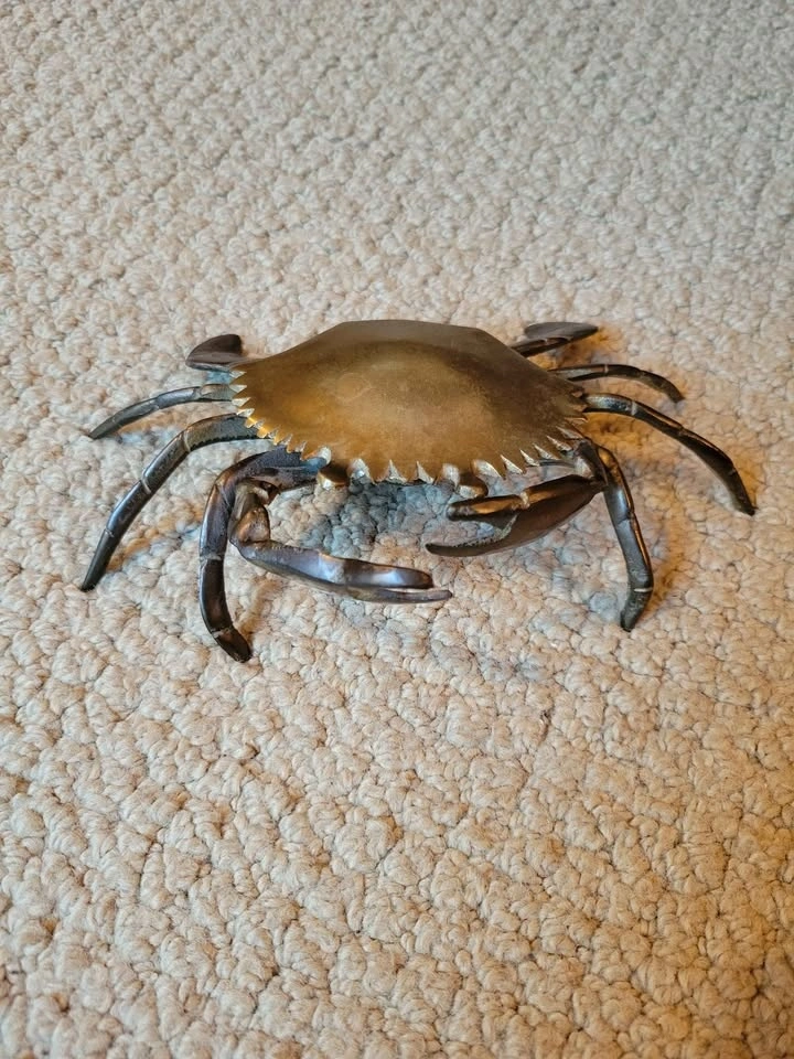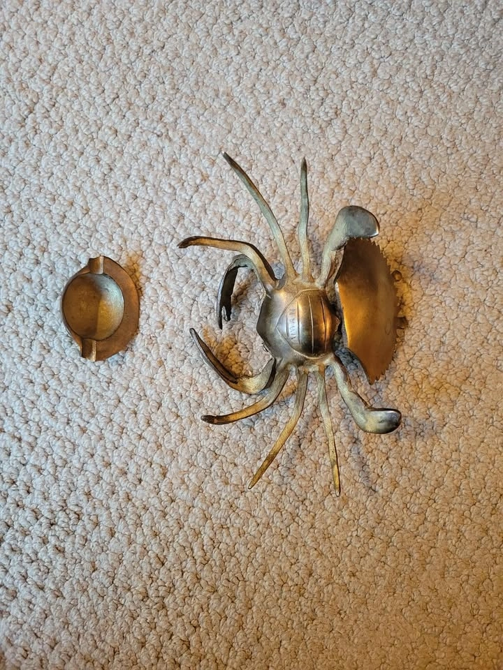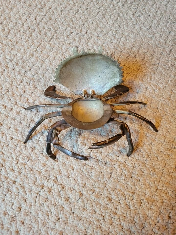 Vintage brass crab ashtray with a hinged lid. This is a popular Mid-Century Modern (MCM) decorative piece, also commonly used as a trinket box or jewelry holder.